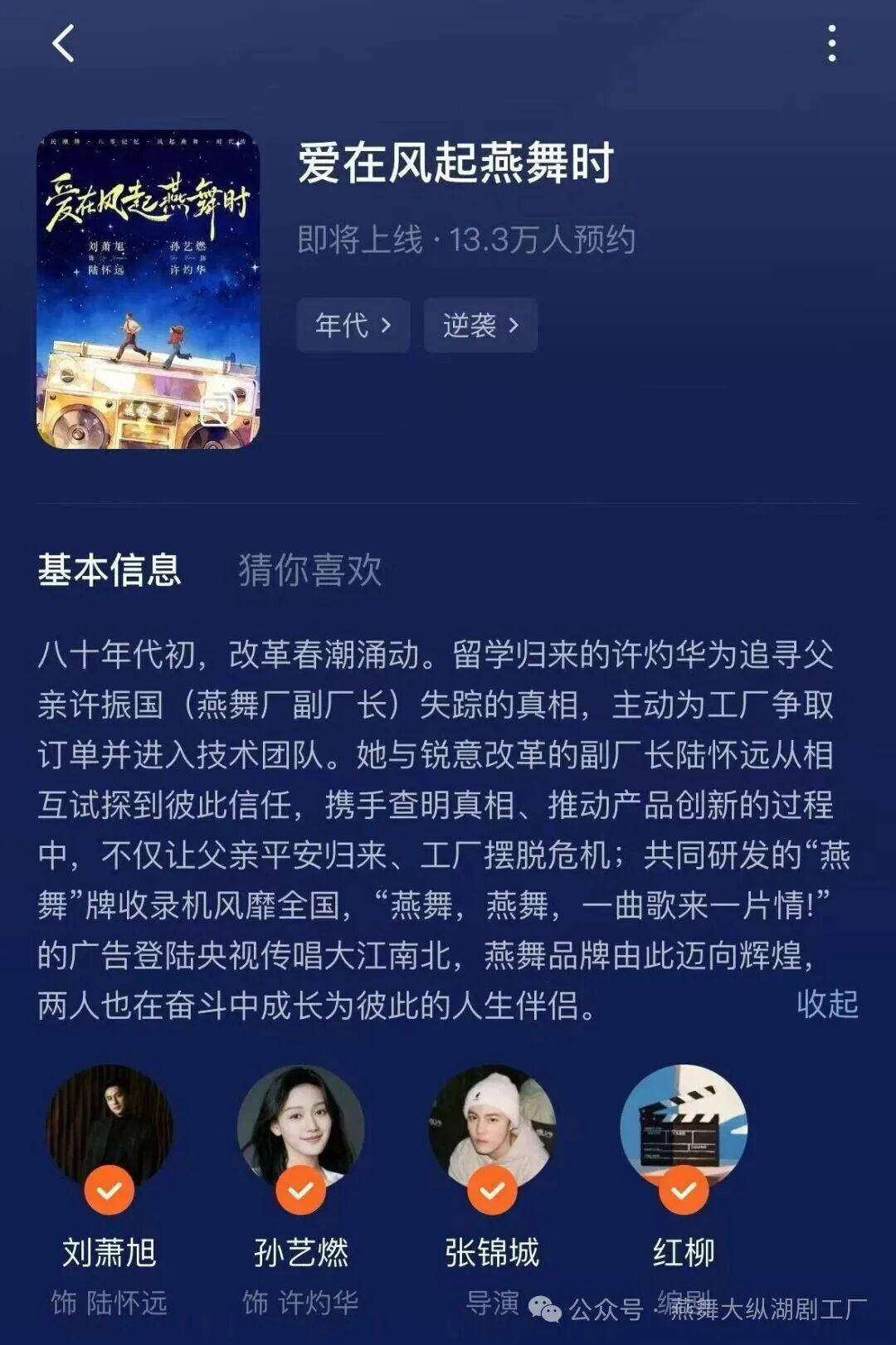 上世纪80年代,“燕舞”收录机以连续八年全国销量第一的佳绩享誉全国,“燕舞,燕舞,一曲歌来一片情”的广告语传遍大江南北,成为镌刻在几代国人记忆中的文化符号,更是盐城工业文明与城市精神的鲜明标识。《爱在风起燕舞时》深度还原燕舞从技术攻坚、市场开拓到品牌腾飞的创业历程,以留学归国千金与改革先锋副厂长的热血故事为主线,串联起一代人的奋斗坚守与家国情怀,艺术化展现盐城“敢为人先、艰苦创业”的城市品格,为网络视听内容注入厚重的时代底蕴与人文温度。