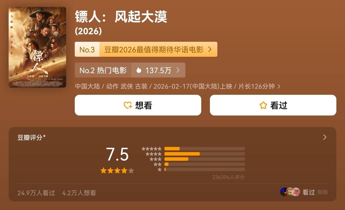 《镖人》逆袭了!从最初预测票房不足10亿,到如今突破13亿,已经成功超出所有人的预期。凭借着7.5分的口碑评分,《镖人》逐渐在春节档崭露头角,不仅排片和票房占比一路上涨,证明了观众的认可,也让这部作品成为了黑马。
