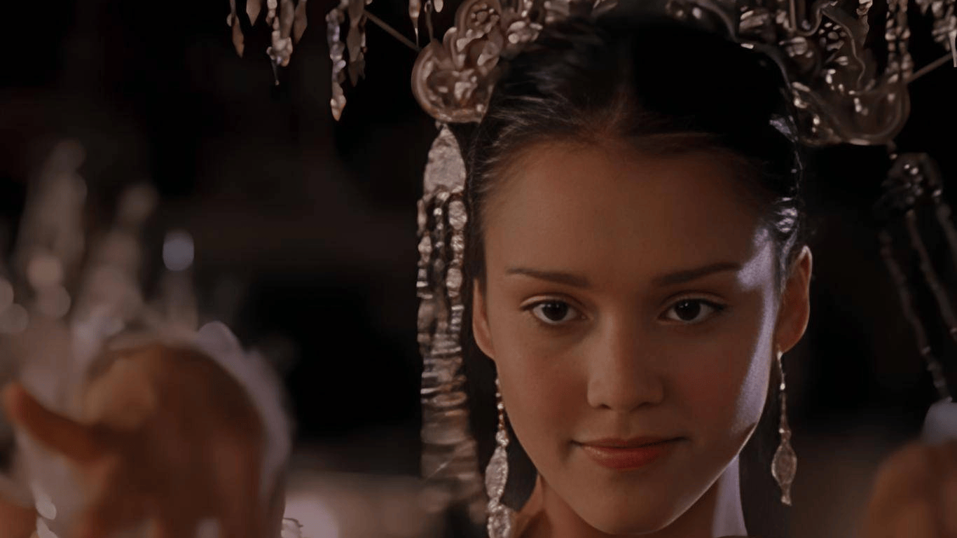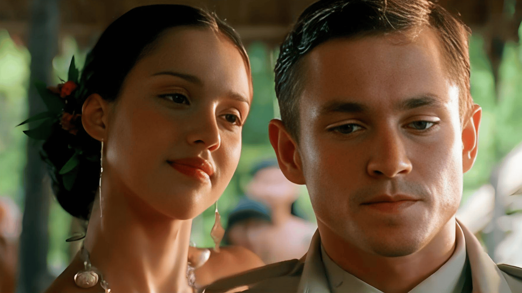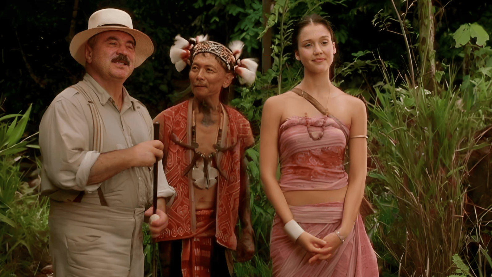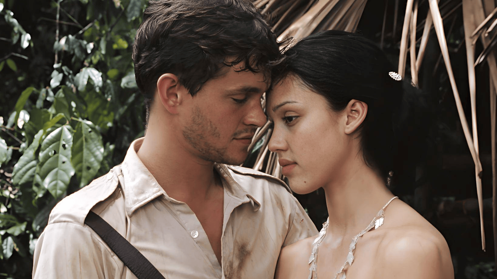 这次把1930年代英属殖民地的"字典情人"习俗搬上银幕,结果端上来一盘又艳又尬的殖民爱情幻想曲。开场那段丛林戏就定下了基调。休·丹西饰演的约翰·特鲁斯科特,一个刚从英国来的年轻殖民官员,穿着笔挺的白西装,在湿热的热带雨林里汗流浃背。杰西卡·阿尔芭饰演的希丽玛一登场,那种"巧克力肤色配金色阳光"的视觉冲击,确实让人移不开眼。她穿着传统伊班服饰,说着蹩脚的英语,既是他语言上的老师,也是床上的伴侣——这种"字典情人"的设定,听起来像学术名词,实际上就是殖民地版的"慰安妇"美化版。