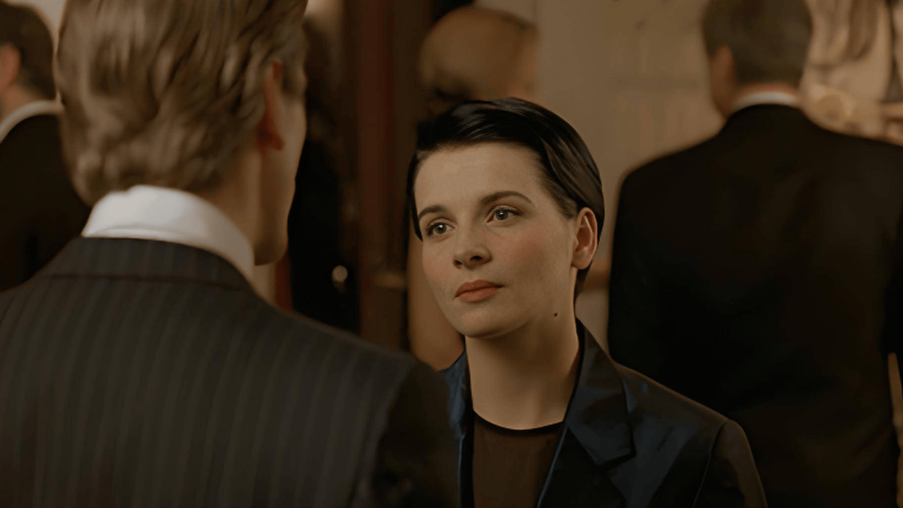 开场那段宴会戏就定下了基调。艾恩斯饰演的史蒂夫,一个即将入职内阁的保守党官员,穿着考究的西装,在人群中游刃有余。然后比诺什饰演的安娜出现了——她是儿子马丁的新女友,穿着简单的黑裙子👗,却像黑洞一样吸走了所有光线。马勒的高明之处在于,他没有让这段关系从"勾引"开始,而是从"被看穿"开始。安娜第一句话就是:"你怕我吗?"史蒂夫回答:"怕。"这种直球对决,让后面所有的偷情都变得像是一场共谋。