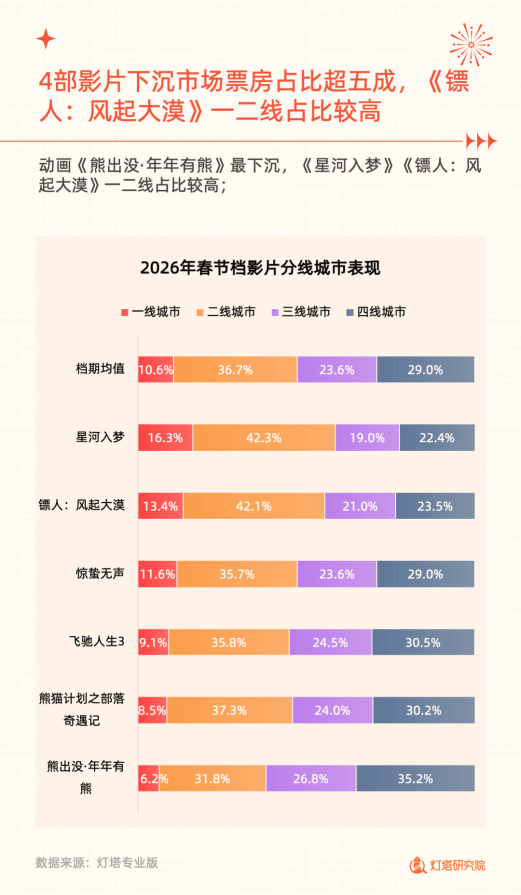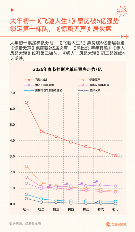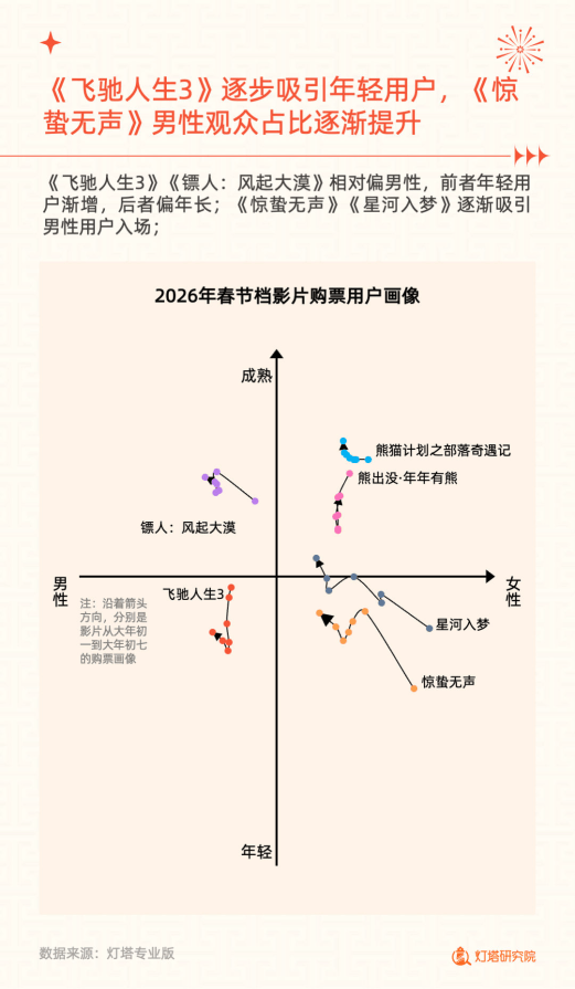 影片竞争呈单片领跑、梯队分明格局,《飞驰人生 3》以 29.3 亿票房夺冠,贡献档期 51% 票房,断层式领先;《惊蛰无声》《镖人:风起大漠》分别以 8.7 亿、8.1 亿位列二、三位,TOP2-TOP4 票房贡献均衡。单日票房上,《飞驰人生 3》初一破 6 亿领跑,《镖人:风起大漠》初三起连续 4 天票房逆跌。影片用户画像各有特点,《飞驰人生 3》年轻用户渐增,《惊蛰无声》男性♂️观众占比逐步提升;城市表现上,《熊出没・年年有熊》下沉属性最强,《镖人:风起大漠》《星河入梦》更受一二线城市青睐,且影片购票偏好呈现明显地域差异。