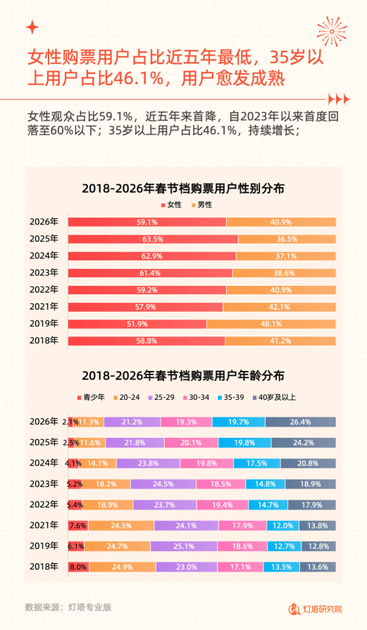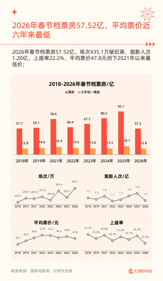 2026 年春节档电影市场票房达 57.52 亿,场次 435.1 万创纪录,观影人次 1.20 亿,平均票价 47.8 元为 2026 年以来最低,上座率 22.2%。大年初一票房 12.8 亿,初二跌幅 34% 超往年,预售近 6 亿且映前 2 天因《飞驰人生 3》增速迅猛。市场下沉趋势加剧,三四线城市票房占比 52.6%;观众结构变化显著,女性♀️占比 59.1% 为近五年首降,35 岁以上用户占比 46.1% 持续增长,用户群体愈发成熟。观影行为上,人均观影 1.20 次,85.3% 用户观影 1 次,单均购票 2.05 张,双人 + 多人观影占比超 70%,社交仍是春节档观影核心需求。