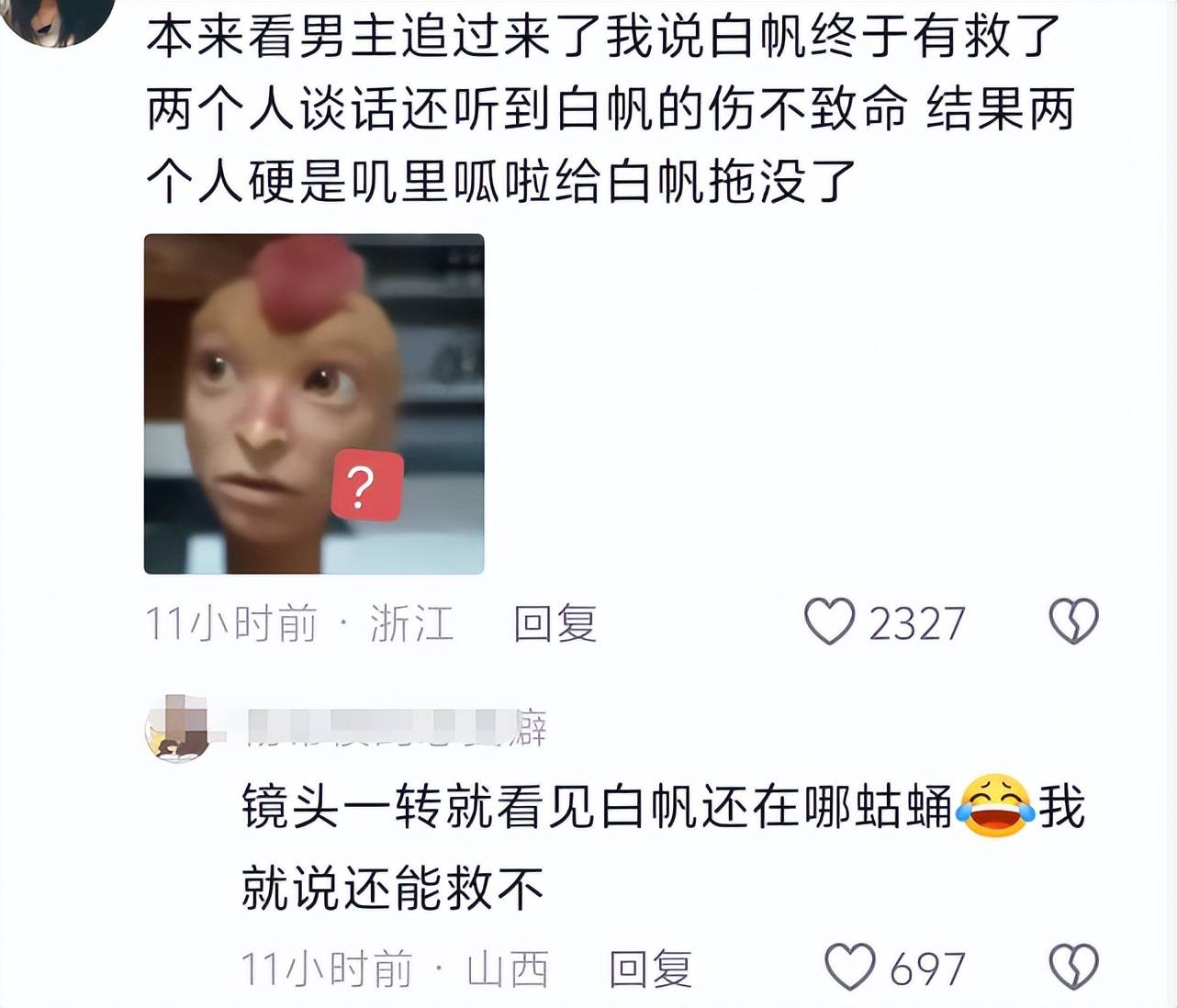 这剧透暗示了白帆在电影中下线的镜头,虽然用词怪但勉强能理解,可更怪的还是说她被“耗死”了。