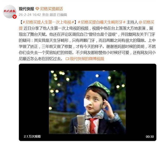 据2月24日报道,主持人尼格买提近日在『社交媒体』上分享了一段考古视频,意外地引发了网友热烈的关注,成功登上了热搜榜单。视频的内容十分珍贵,是青涩的尼格买提首次登上电视舞台时的表演。尽管年纪尚轻,但他表现得落落大方,毫不怯场,仿佛天生就与舞台有着无法割舍的联系。这股与生俱来的舞台天赋,哪怕岁月流转,也依旧清晰可见,令人感慨不已。