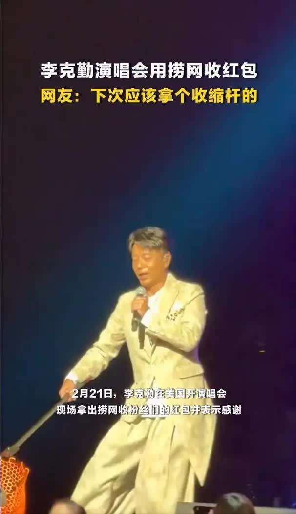 2月22日的报道让人忍俊不禁,李克勤在美国的演唱会现场,竟上演了一场让海外观众眼前一亮的名场面:他手持一个特制的大型捞网,站在舞台边,像捕鱼一样捞取台下粉丝递上来的红包🧧。红包🧧多到几乎装满了网兜,场面既壮观又搞笑,网友纷纷调侃为红包🧧收到手软,这番情景让人不禁捧腹。