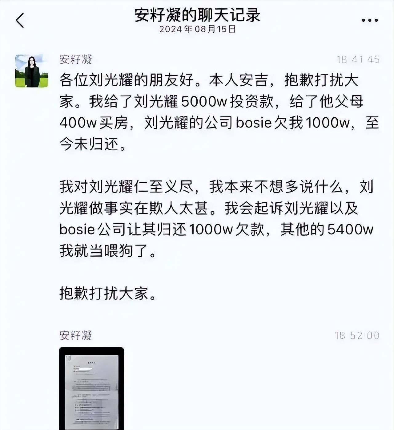 离婚后的局势愈加复杂,刘光耀在公开信中透露,2024年5月,安吉便与一位新男友开始了恋情,而她此前代孕的孩子也在6月诞生在美国。8月,安吉与新男友一同前往美国接回孩子,而刘光耀则在同月正式宣布离婚。真正引爆这场风波的是一份借款协议。2024年8月15日,安吉方面公开了其父亲安怀略与刘光耀旗下bosie公司的1000万元借款协议,并指控刘光耀拖欠债务,同时还曾接受安吉5000万元的投资款,并支付给其父母400万元购房款。