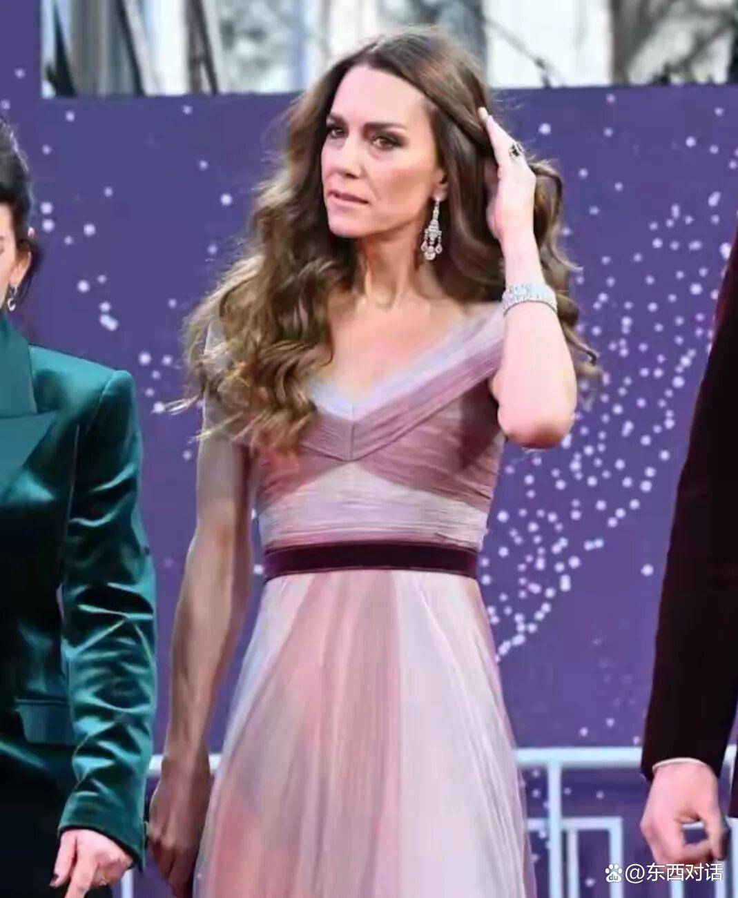 然而,只有真正细看的人,才能透过这份精心打造的优雅,看到她强撑之下的真实状态。 纱质礼服本就容易显胖,可穿在她身上,却依然是“薄薄的一片”,“瘦得像张纸片,皮包骨头”。 手上的青筋根根分明,面色苍白得像纸,嘴唇也泛着白,从前那种健康红润的光泽不见了。 当她对着镜头露出标志性的微笑时,脸上的褶子清晰地显现出来,让她看起来比44岁的实际年龄要苍老不少。 肢体语言专家指出,她和威廉当晚都显得很紧张。 威廉不停地摆弄手指,低着头,刻意躲避镜头;而凯特,虽然双臂自然垂落试图展现从容,但那微微咬紧的牙关,藏不住她压抑的疲惫和身体里的虚弱。