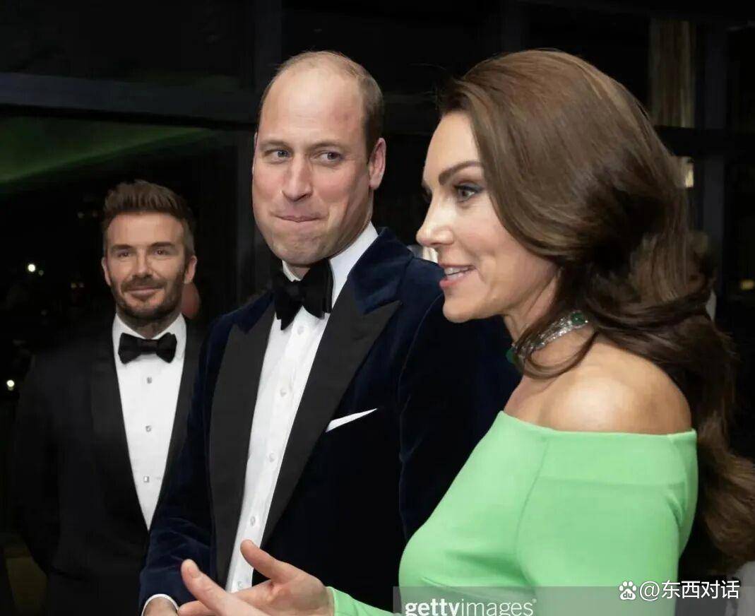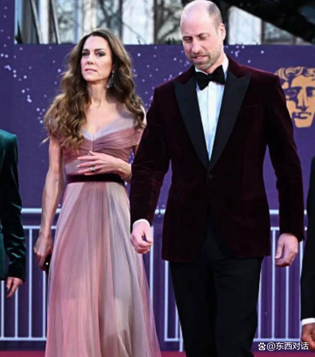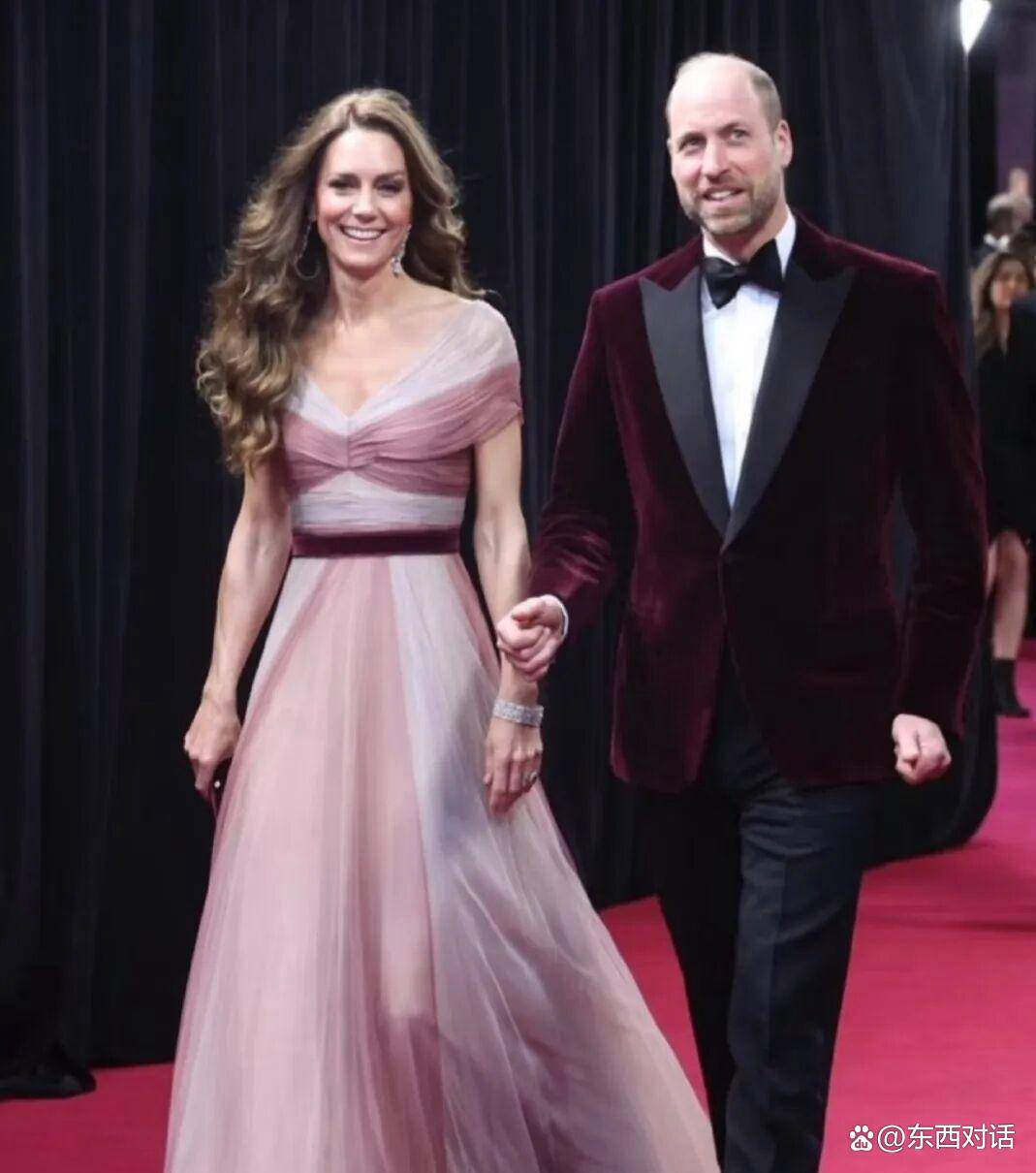 当晚的凯特,选择了一条有故事的裙子👗。 她穿的是2019年就曾穿过的古驰玫瑰粉色渐变薄纱长裙👗,不是什么新定制的高定礼服。 腰上系了一根酒红色的天鹅绒腰带,手里拿着同色系的手拿包。 媒体和公众一眼就看出,她身旁的威廉王子,那身酒红色天鹅绒晚宴夹克,与她的腰带颜色严丝合缝。 熟悉他们的人都知道,这对夫妇平时并不常穿“情侣装”,但在这个尴尬的节点,这种视觉上的高度和谐,被广泛解读为刻意释放的“团结”信号,意在对外展示王室核心的稳固。