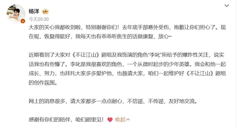 2月27日,『杨洋』发文回应《不让江山》争议,他表示自己的手是在去年的年底受伤的,幕前恢复良好,重点来了,他突然话锋一转,以剧组的角度表示,希望粉丝维护剧组的创作氛围,而对于“剧本魔改”和“戏份压缩”的核心矛盾只字不提,这一看就知道,肯定是剧组给『杨洋』施压,让发布的这一内容,原本这确实能奏效,奈何『杨洋』手肿的情况被曝光。