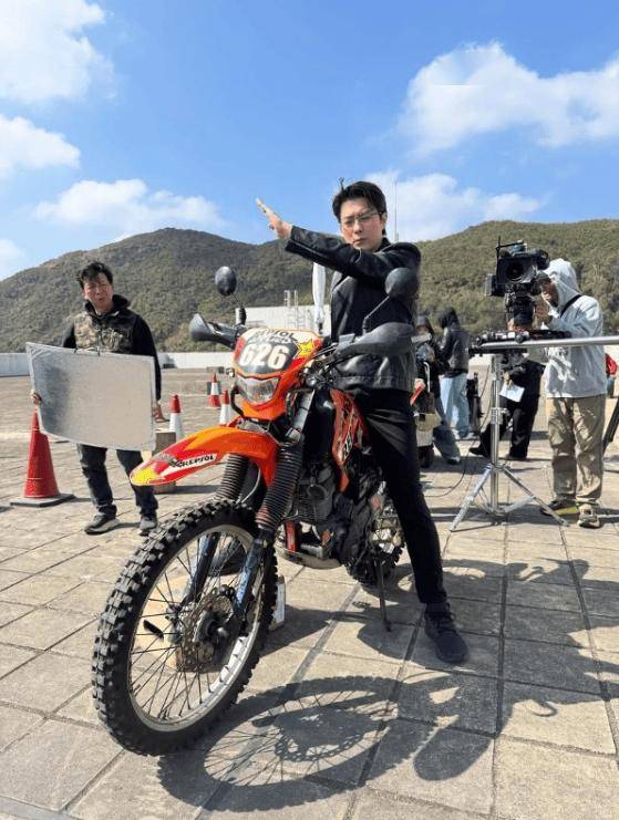 此外,他又分享穿皮夹克骑电单车的帅气照 “挽回形象”:“一场要摔电单车的戏,为了摔完完好无损,其实背后需要这么多人帮忙。”