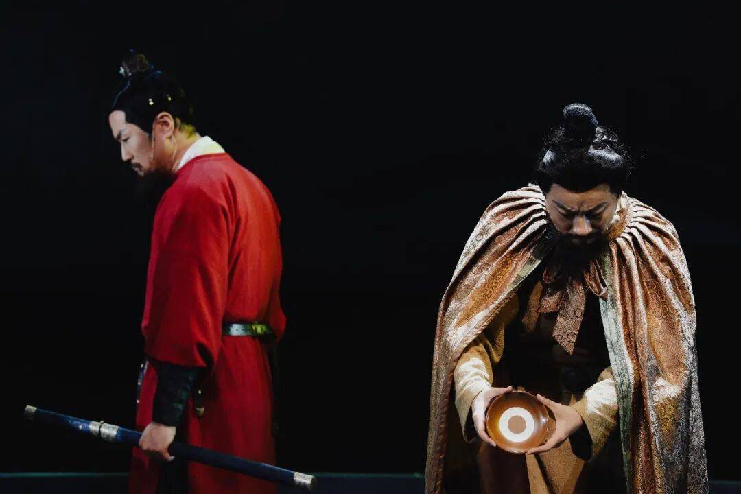 同样,剧中反复出现的空置龙椅、熠熠生辉的“金书铁券”、钱镠用于警醒自己的圆木枕与粉盘等道具,都超越了其简单的实物功能,升华为承载权力、信诺、勤政、戒惧等厚重历史意义的戏剧符号。这种写意的舞台美学,成功构建了关于“起源”的精神图景,继而再现了秩序与原则得以确立的史诗瞬间。