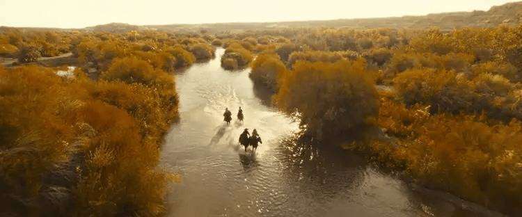 除了精彩的武打场面,影片的中式美学更是令人眼前一亮。黄沙漫卷、夜色深沉、白雪皑皑、烈火熊熊,每一处布景都如同一幅精心勾勒的画卷。特别是影片结尾,那群英雄骑马奔向长安的镜头,山峦叠嶂之间,马蹄飞跃过潺潺溪水,溅起的水花与层林尽染的五彩交织,既展现了江湖豪情的豪迈,也承载着东方意境的悠扬。整个场景展现了中式武侠的浪漫与悲壮,令人陶醉。而片尾彩蛋里,三位武侠界宗师袁和平、张鑫炎、吴彬同框交流,提到“什么时候江湖上还能看到这么好的身手”,则不经意地透露出华语武侠的传承与期许。