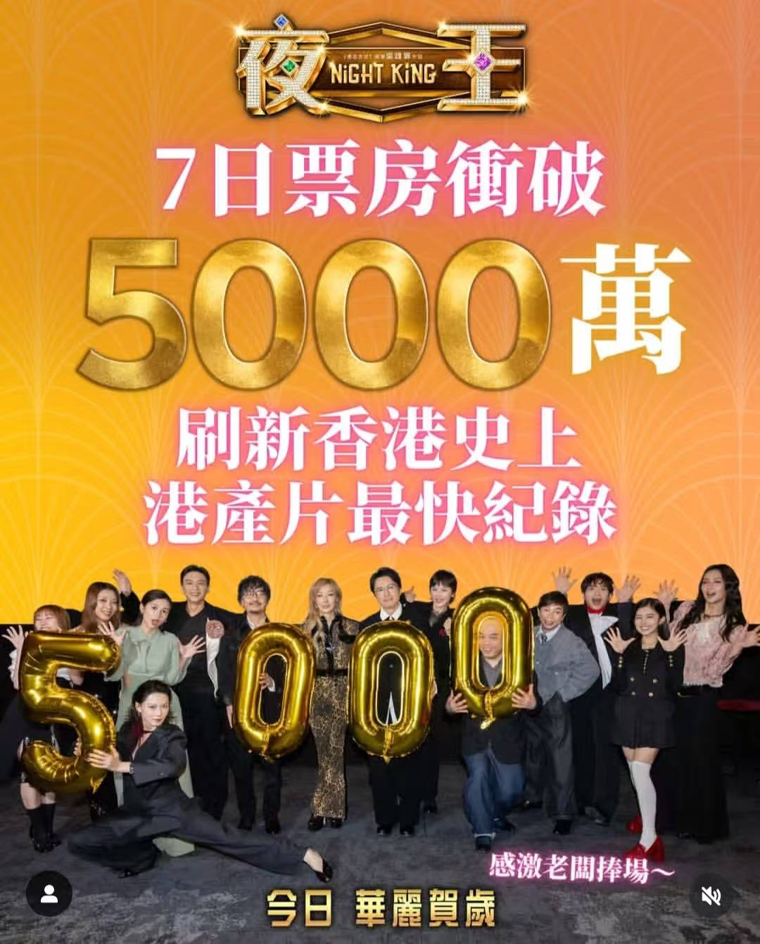 “栋笃笑宗师”黄子华喜剧新片《夜王》定档2月17日(大年初一)于香港上映,在春节7天时间票房便冲破5000万港币,刷新香港史上港产片最快纪录。