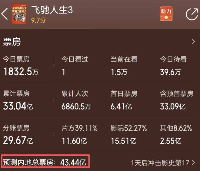 飞驰人生3》以33亿票房遥遥领先,且总票房有望达到43亿,俨然在这个超大档期的激烈角逐中独自领跑。导演韩寒可谓赚得盆满钵满,而主演『沈腾』凭借此片成为了中国影史上首位票房突破400亿的演员,距离第二名『吴京』的差距也逐渐拉大。这个成绩,当然少不了片方对细节的极致把控。影片不仅在技术上实现了全面升级,特别是结尾那场长达四十分钟的赛车戏,场面震撼、燃爆全场,给观众带来了极致的视觉与情感体验。此外,影片中藏匿了不少彩蛋,懂的人看了都禁不住热泪盈眶。