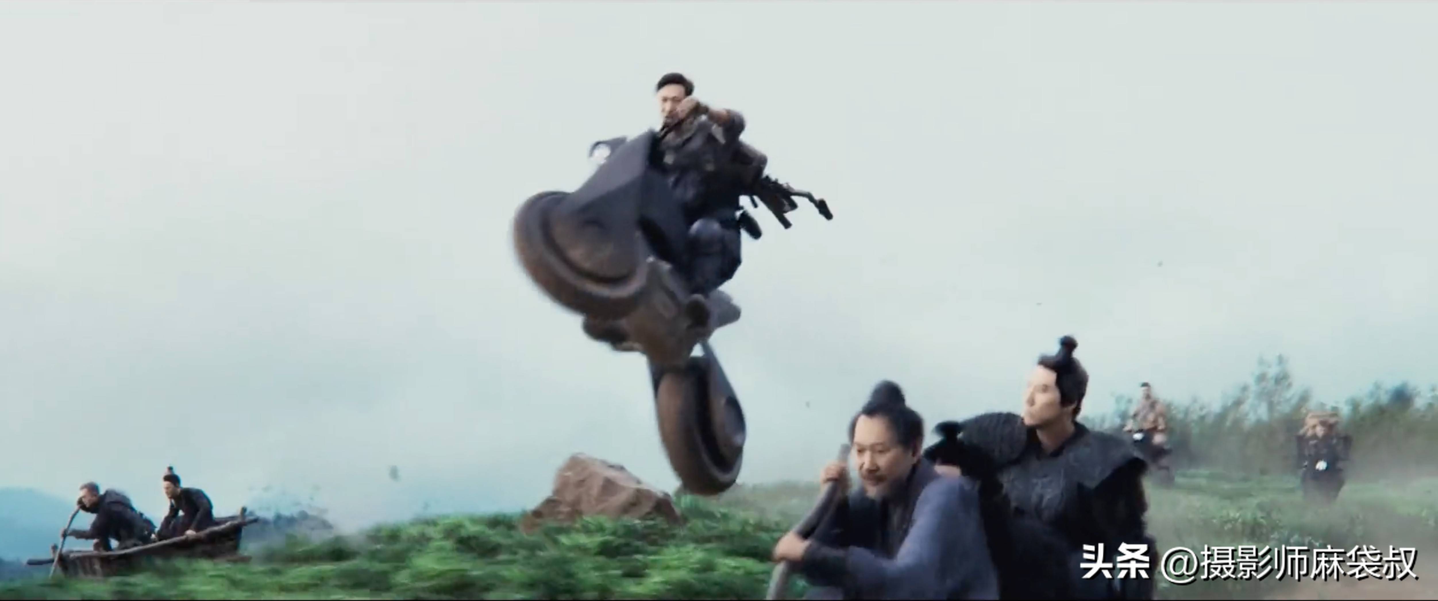 至于打斗场面,茶园里的追逐戏中,反派们居然拿着冲锋枪、无人机和防弹衣这些现代装备,却轻松被秦军的弓箭手击败,摩托车竟然还跑不过木车?更荒谬的是,几场飞车戏使用了大量AI和特效,人物的动作和背景完全不真实。看来这3亿多的制作成本大部分都花在后期特效上了,但效果实在差劲,简直可以叫做《
