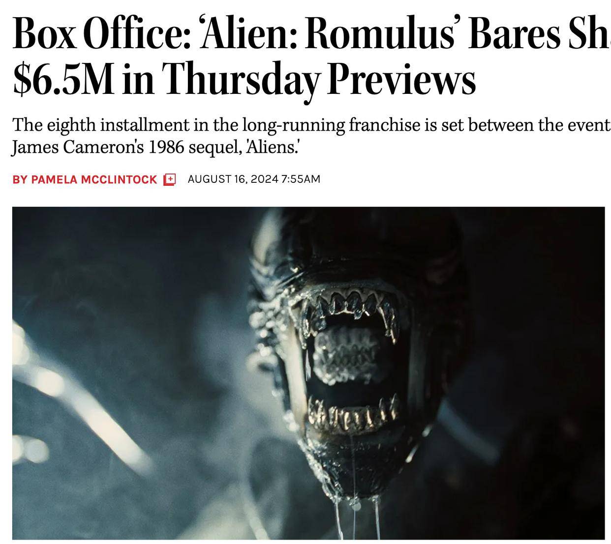 《异形:夺命舰》的上映情况良好,这部电影的票房稳定上升,《THR》的影评人帕梅拉在个人专栏点评了这部电影。帕梅拉赞扬《异形》的结构分明,虽然这部大型系列的热度持续走低,新世纪的作品难以重现上世纪八十年代的辉煌,不过《异形》具有特殊的优势,那就是该片的机构分明,逻辑也相当清晰。在帕梅拉看来,很多当红科幻片已经达不到结构分明的要求,诸如《水之道》的口碑那么好,实际上这部系列的结构已经开始模糊,这就导致了大家对《阿凡达》第三部和第四部作品的进展有点担忧,这是影评人赞扬《异形》的原因。帕梅拉还希望詹姆斯·卡梅隆重拾自己执导《异形》时候的逻辑性,帮助当今影坛回到“棱角分明”的时代。