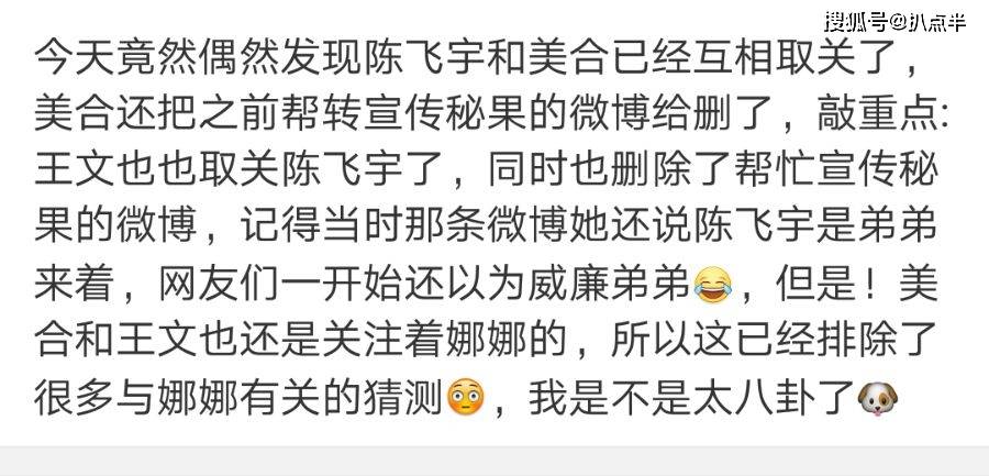 也因此到了2017年3月,綦美合忽然在发了一条莫名其妙的“突然关系变淡”的消息后,便删除了之前与陈飞宇全部的互动。
