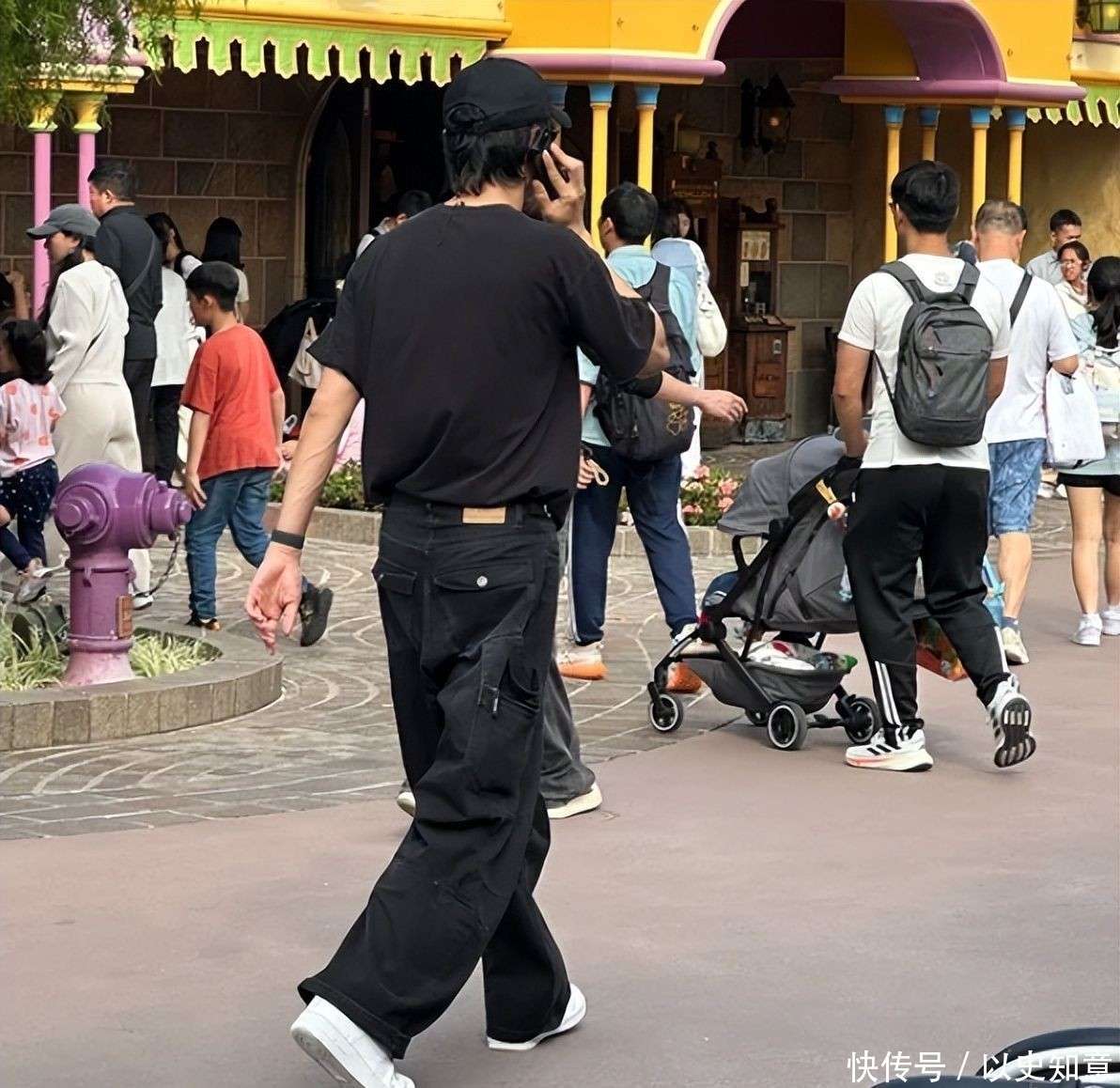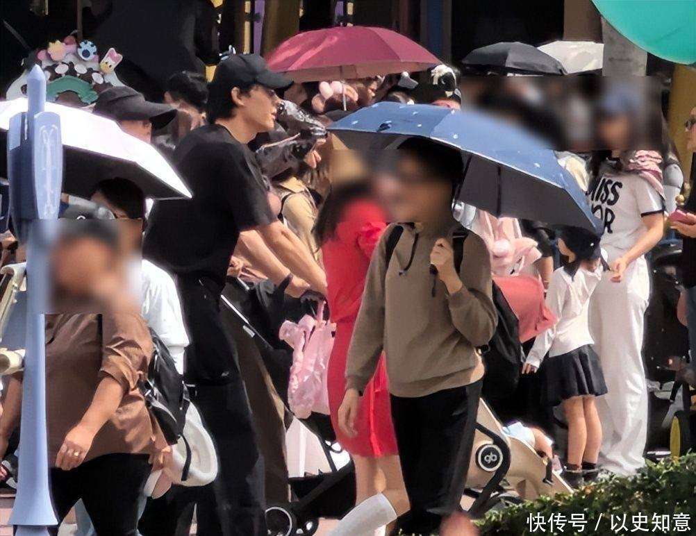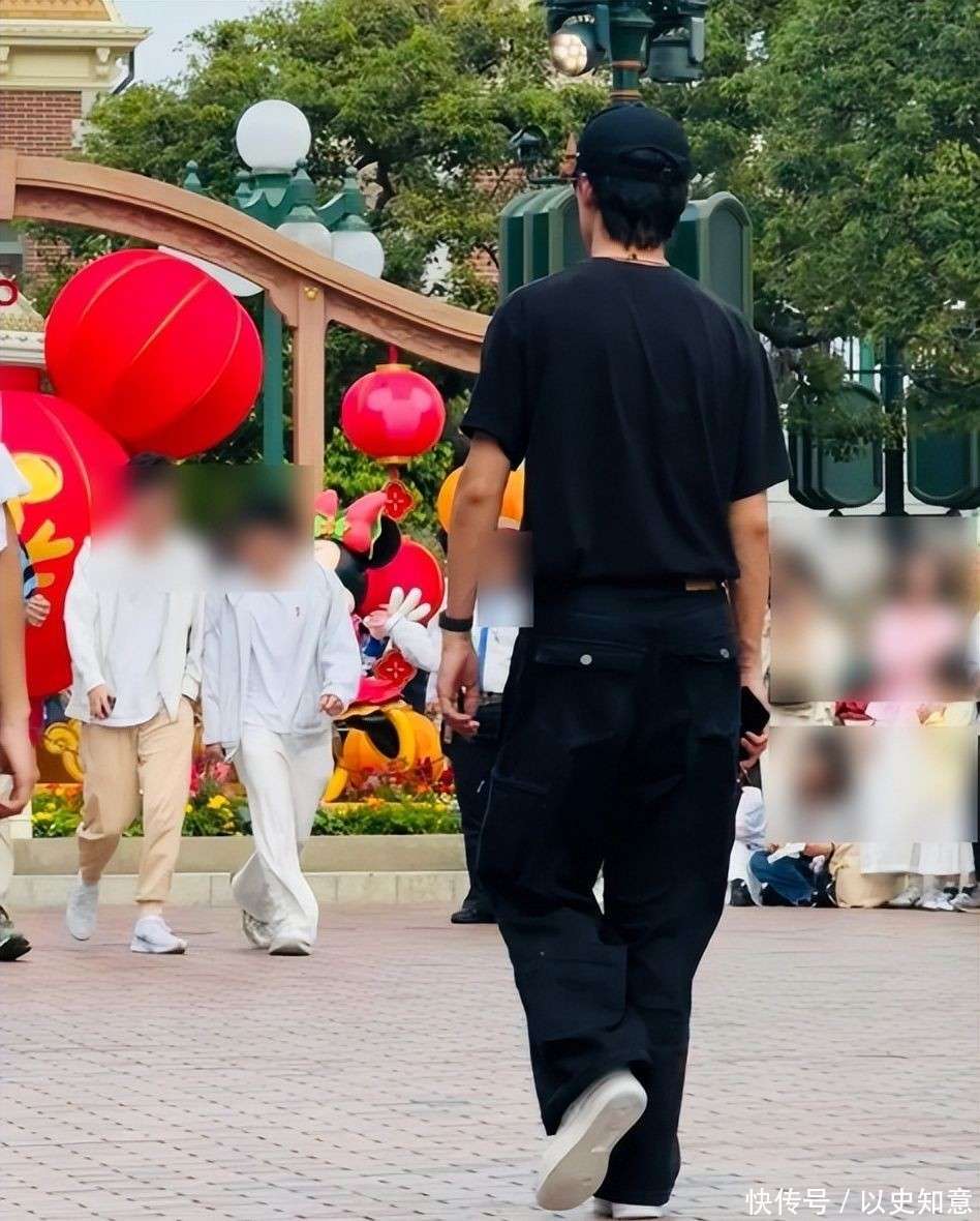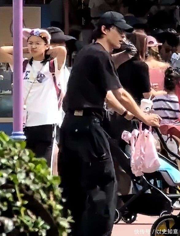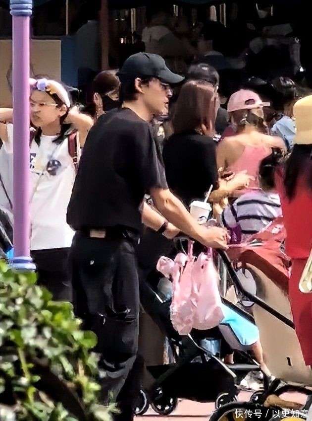 他把所有的体力活都包揽下来:一手稳稳推着婴儿车,另一只手提着满满的迪士尼限定商品,动作迅捷且毫不犹豫,展现了事前的周全准备。他的面部表情几乎没有太大的波动,情绪似乎很少外露,目光大多集中在婴儿车上,偶尔扫视一下周围环境,确保妻子和女儿的安全。