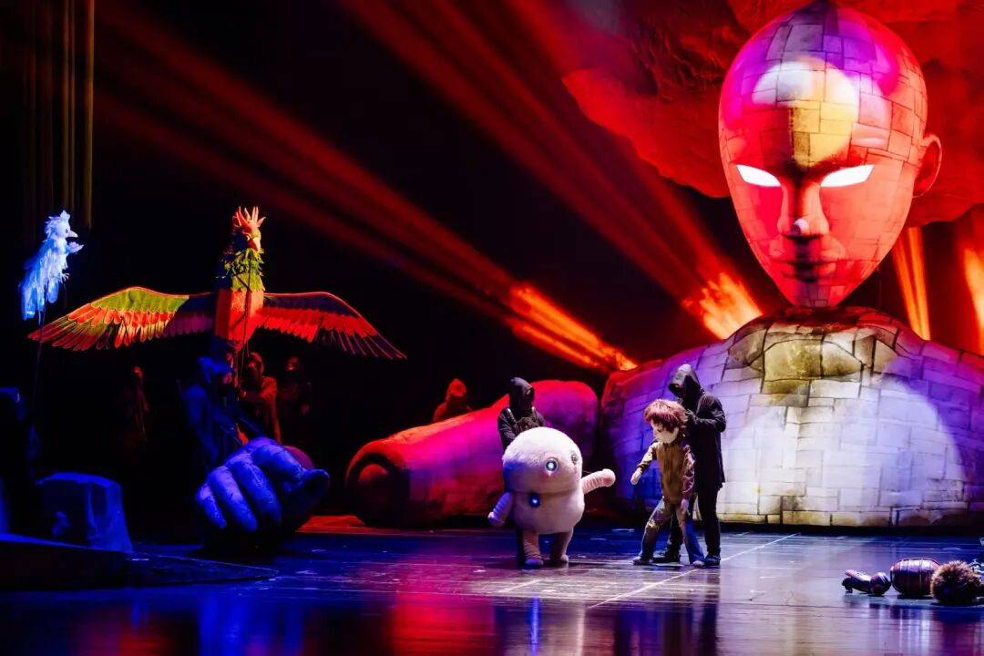 最为震撼的,当数目前全国室内剧场中尺寸最大的巨型偶的出场。当宽10米、高5米的“巨灵”用手拉开舞台帷幕,全场惊呼。