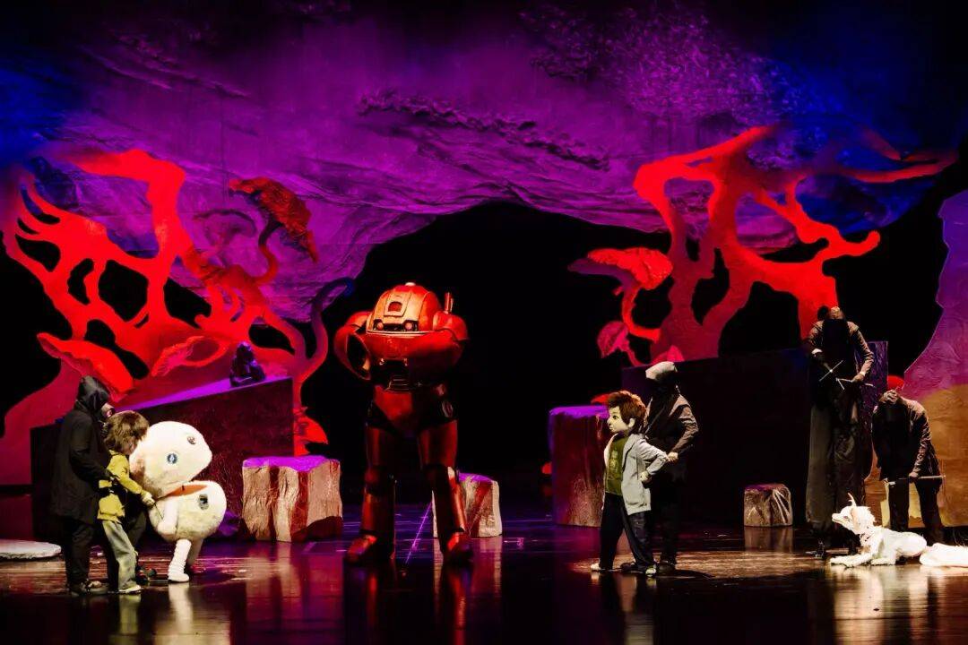 当蓝色的海浪光影铺满剧场上空,观众犹如置身海底。演员们操纵着木偶穿梭于观众席间,鱼群仿佛在身边游弋,如梦如幻。而来自爱尔兰作曲家创作的配乐,以迪士尼式的风格,为这场东方奇幻之旅注入别样浪漫。