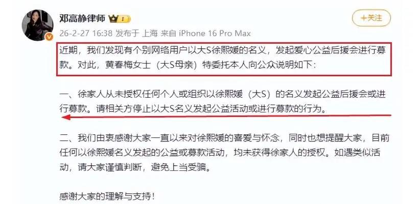 这次公益活动的发起,S家的人毫不知情。于是S妈委托律师邓高静维权,希望粉丝们认真辨别,不要被“有心人”利用了。