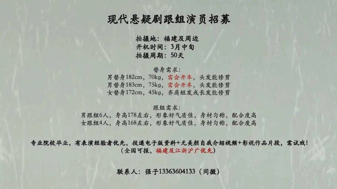 剧中多个角色未定,欢迎名大经纪公司及演员朋友投递资料!