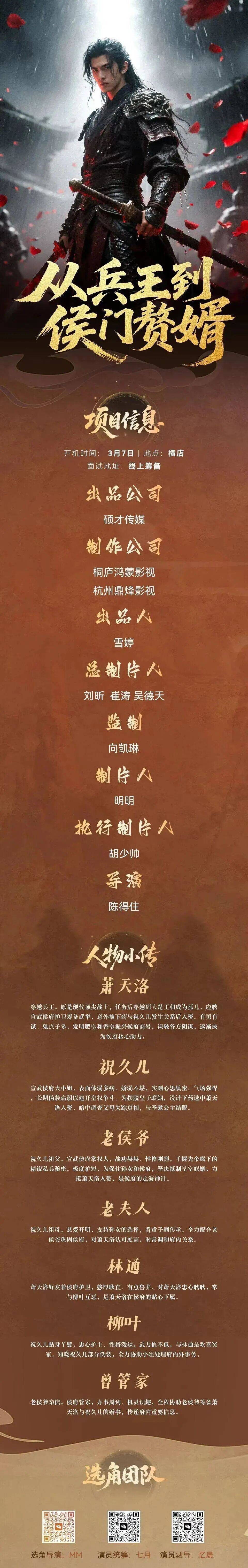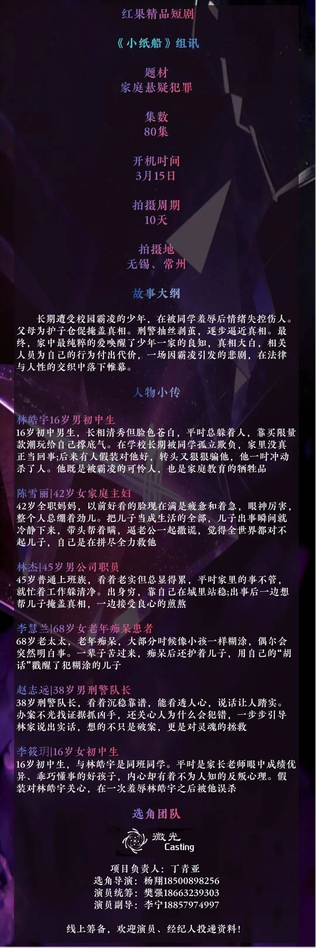 免责声明:戏客Seeker公众号(“本平台”)中全网组讯的信息、内容(“组讯信息”,包括但不限于影视项目名称、项目介绍信息、出品公司信息、导演信息、选角团队信息、拍摄相关信息、联系方式等)均来源于内容信息相关方提供或『互联网』公开信息。本平台不对组讯信息的真实性、准确性、完整性、及时性、关联性、适用性及安全性提供任何明示或默示的担保。请您谨慎参考或使用组讯信息,并确保您的人身、财产安全,本平台不对您使用或参考组讯信息而造成的后果承担任何责任。