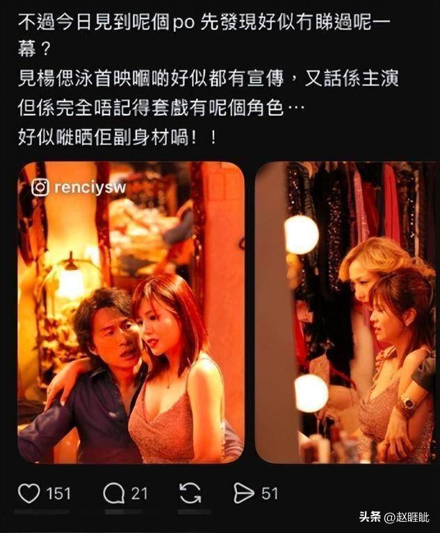 杨偲泳将自己在《夜王》中的被删戏份,悄无声息地发布在『社交平台』上。这段影片包括了激情吻戏和性感造型,完全没有任何控诉片方的文字,也没有一丝卖惨的情绪,甚至连一句抱怨都没有。她仅仅是简单地发布了这个片段,配文轻描淡写,仿佛是在和粉丝分享一段普通的拍摄花絮。