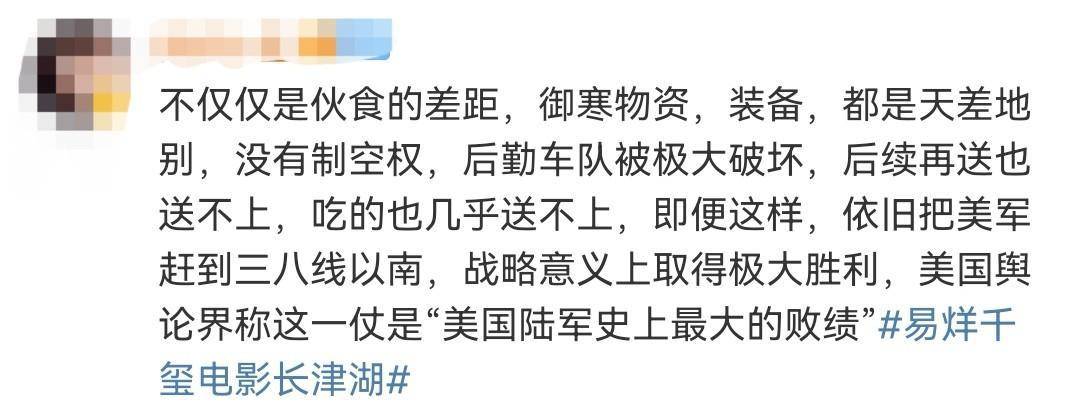 当时的国际社会,大多数国家对中国保持观望态度。一方面,他们想看看这个新生的国家究竟是强是弱;另一方面,也有一些国家担心中国将来会威胁到他们的利益,于是希望借助美国之手铲除中国。 在这种复杂的国际形势下,中国志愿军清楚自己肩负的历史责任与使命。事实证明,长津湖战役的胜利不仅捍卫了中国的尊严,更使美国军队遭遇了史上最大规模的撤退,这一胜利让全世界重新认识了中国,震慑了更多国家。 试想,如果1950年,抗美援朝战争没有取得最终胜利,那么这个年轻的中国或许早已在国际舞台上被扼杀在摇篮里。长津湖战役,作为抗美援朝战争中最为关键的一场战斗,不仅成功迫使美军撤回三八线,还为接下来的和平谈判奠定了重要基础。 无数中国志愿军战士,在极度艰苦的环境下,付出了生命和鲜血,誓死捍卫了中国人民的安全。长津湖战役的残酷远比电影呈现的要惨烈得多,而这场胜利的战略意义,也远比影片中所传递的要更加深远和深刻。 正如一位观众所言,历史上的长津湖战役,是中美两国都不愿提及的血战。对美军来说,这是一场没有任何胜算的战争;而对中国志愿军而言,这也是一段不愿多回忆的噩梦。我们的战士们,在极其恶劣的条件下与美军浴血奋战,实在是太不容易了!《长津湖》真的是一部值得一看的影片! 9月30日,一定要走进电影院🎦,亲身感受那段波澜壮阔的历史,让我们一起向历史致敬,向英雄致敬,向最可爱的人致敬!