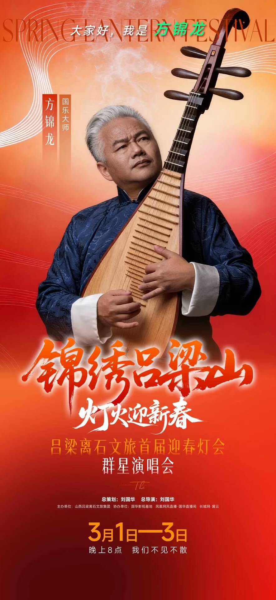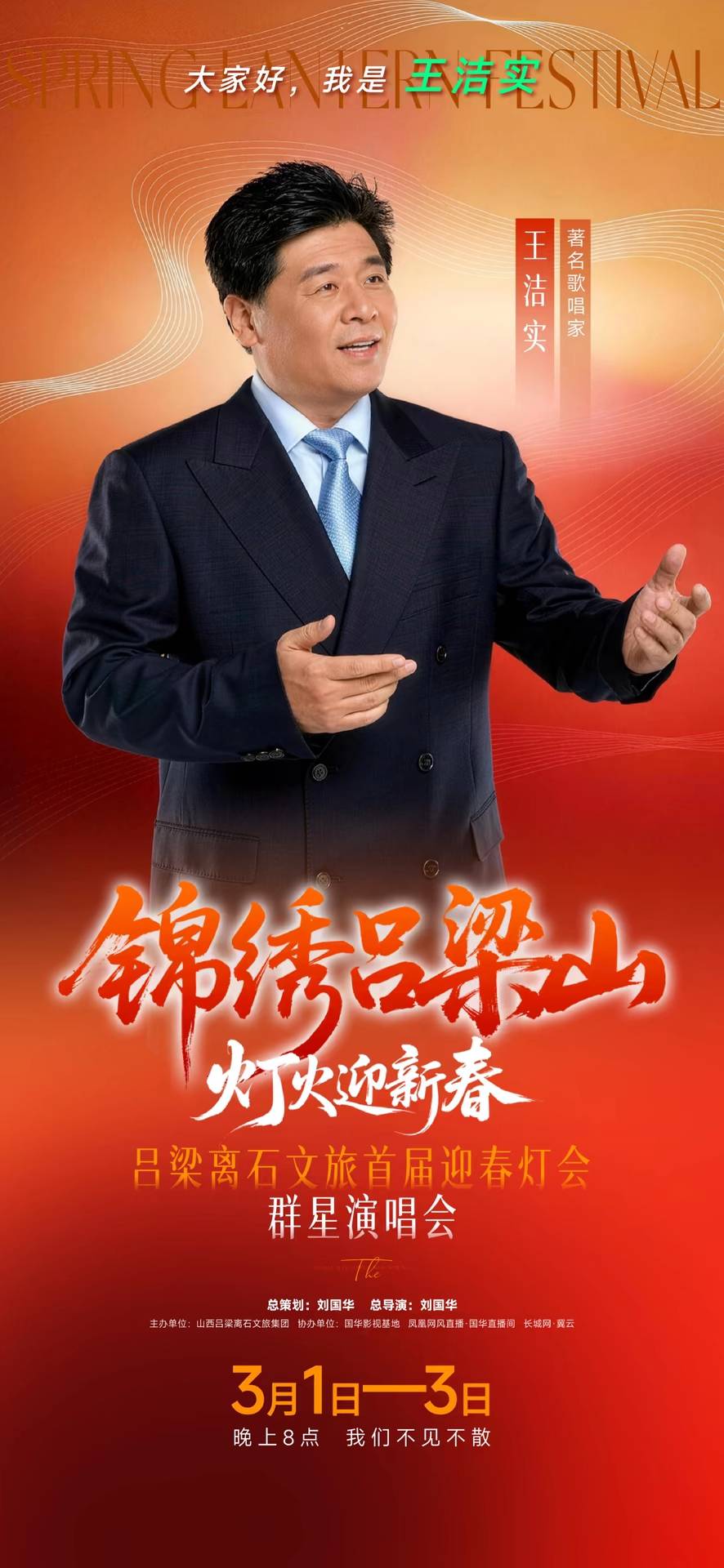 本次演唱会由著名导演刘国华担任总策划、总导演,特邀著名主持人江平、著名歌唱家王洁实、上官燕联袂担纲主持。演出阵容星光熠熠、实力强劲: