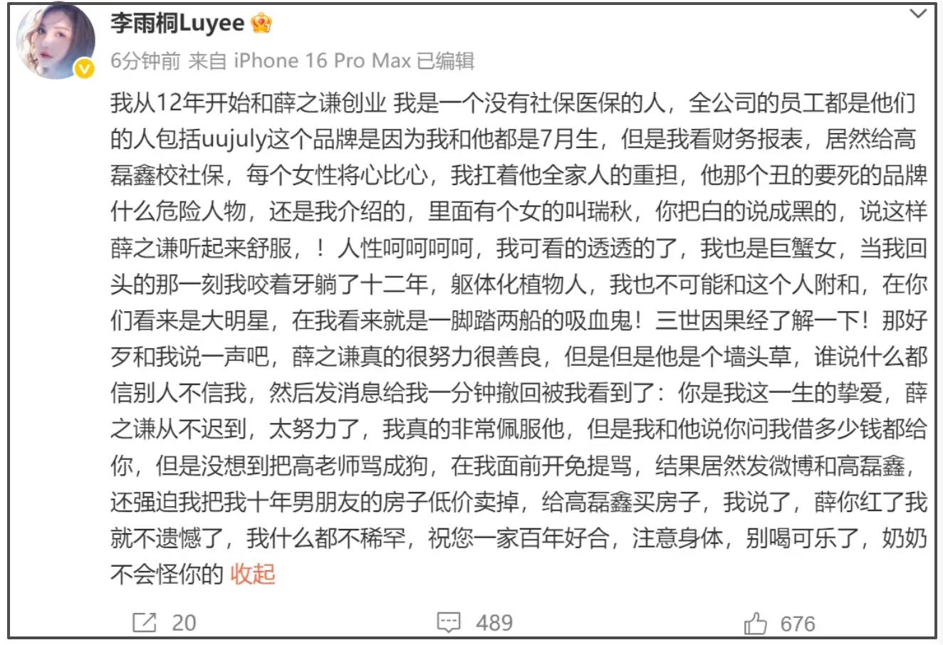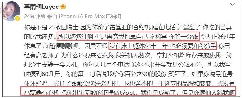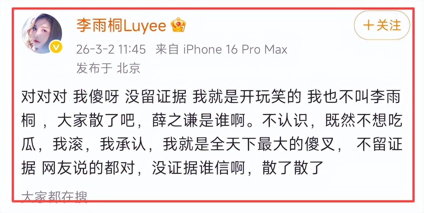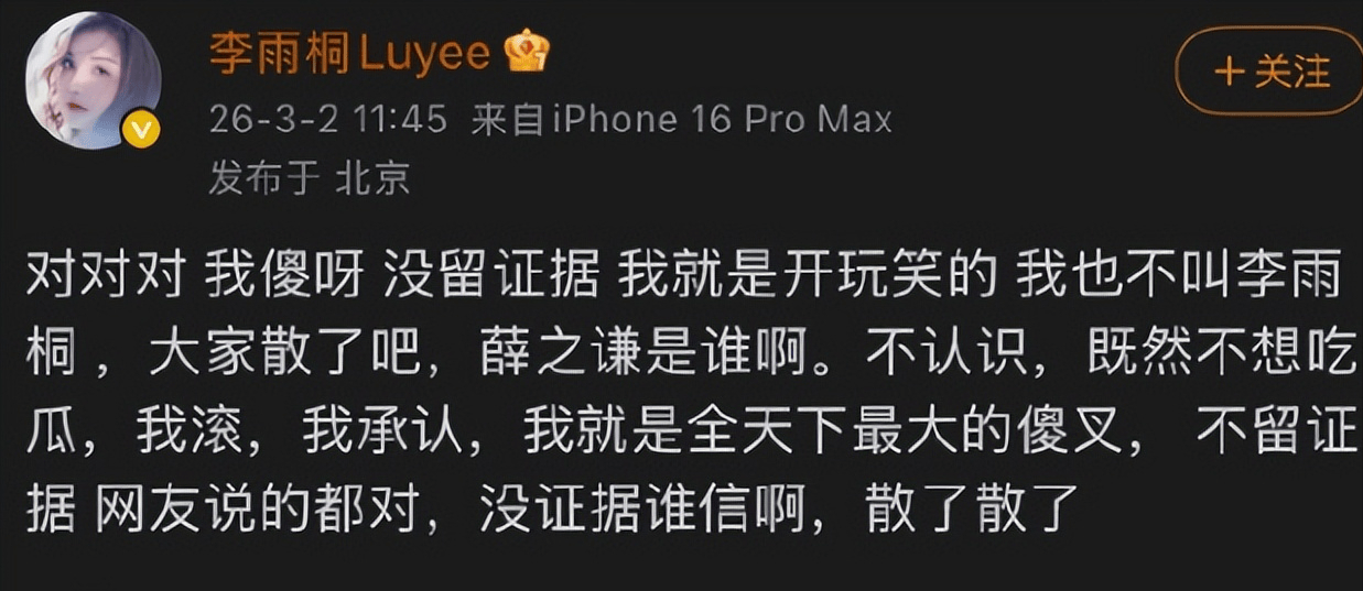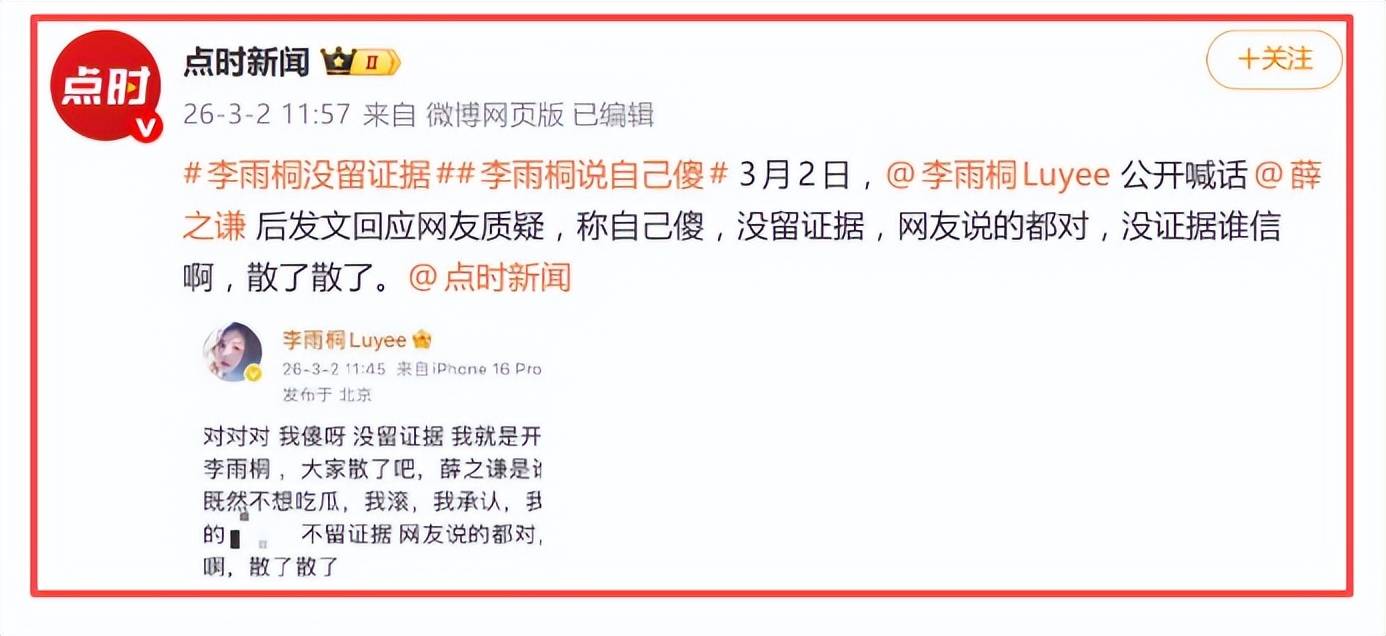 李雨桐这次最扎眼的,不是指控有多“新”,是状态有多“乱”。前一条还在喊“公开真相”,后一条就自嘲“我傻没留证据”,再后一条又说“不认识”“散了”。半小时的转弯,比综艺剪辑还急。