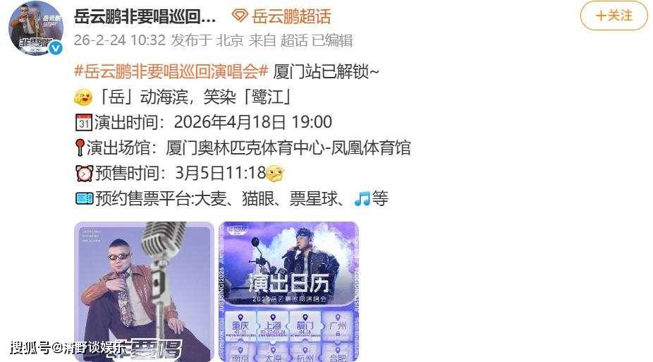 2026年马年春晚名单里没有岳云鹏,这不是临时被刷掉,也不是身体出问题,他本人和团队都没提到退出这两个字,相反在3月5日11点18分,他的“非要唱”巡回演唱会厦门站准时开票,这个时间选得挺有意思,11是要的意思,18是要发的意思,他自己说过这是穷日子过久了留下的习惯,信个彩头不为迷信就图个心安。