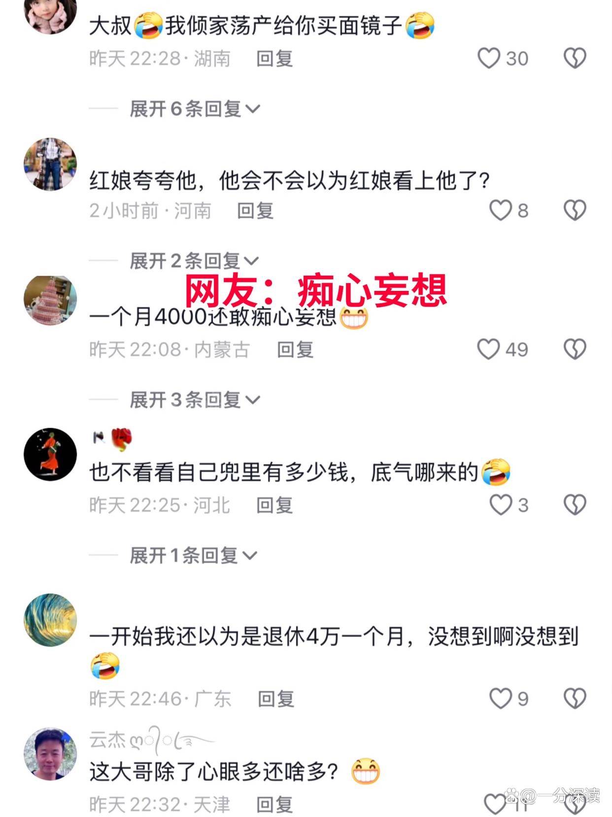 也有人调侃:“红娘夸夸他,他不会以为红娘看他了吧?也不看看自己兜里多少钱,哪来的底气啊!”