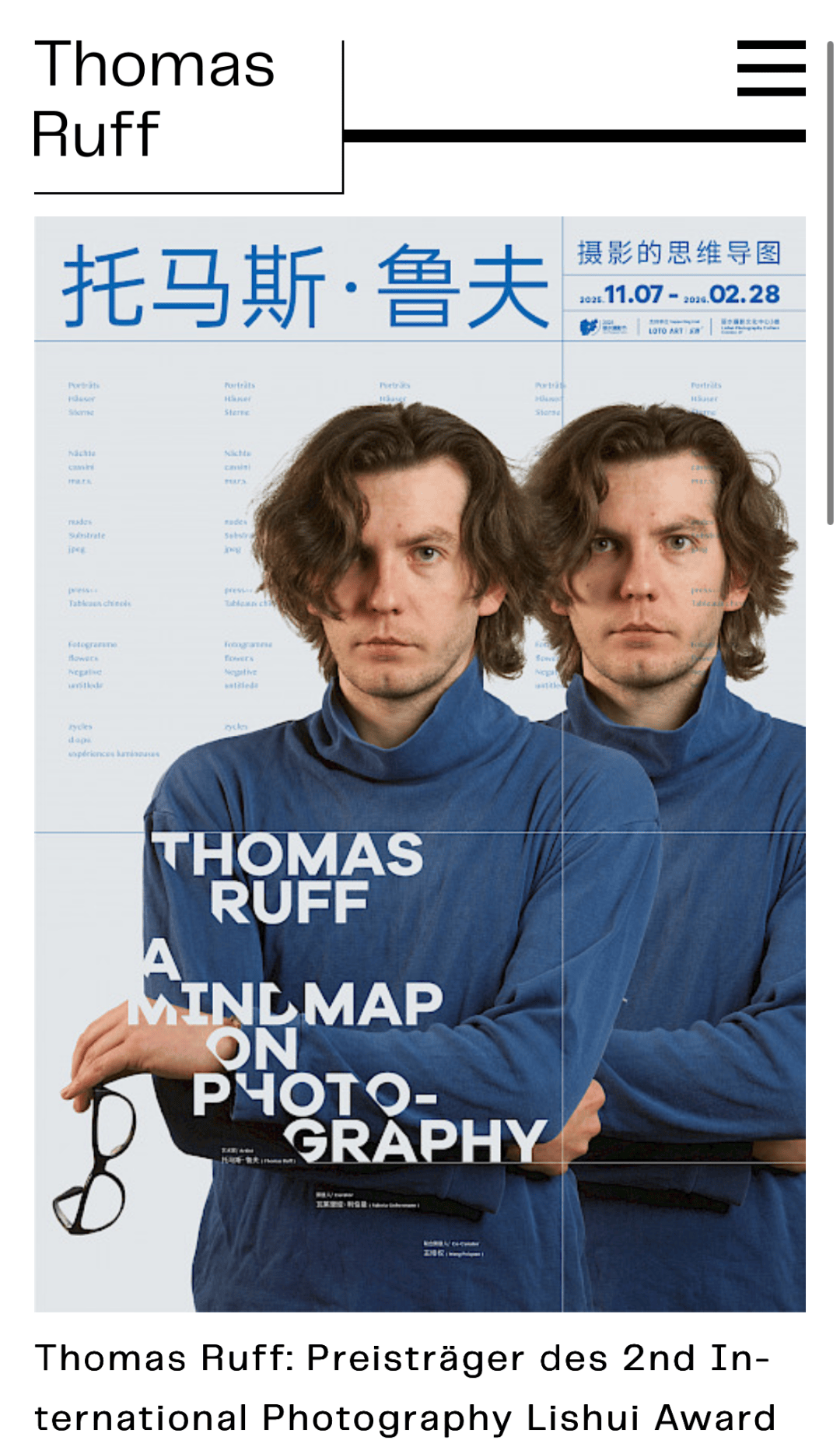 托马斯·鲁夫大型个展《托马斯·鲁夫:摄影的思维导图》将于2025年11月8日在丽水摄影文化中心正式启幕。此次展览将展出贯穿其四十余年艺术生涯的18个系列作品,云集艺术家众多知名系列。托马斯·鲁夫的最新力作《光的实验》也将首次于中国亮相。