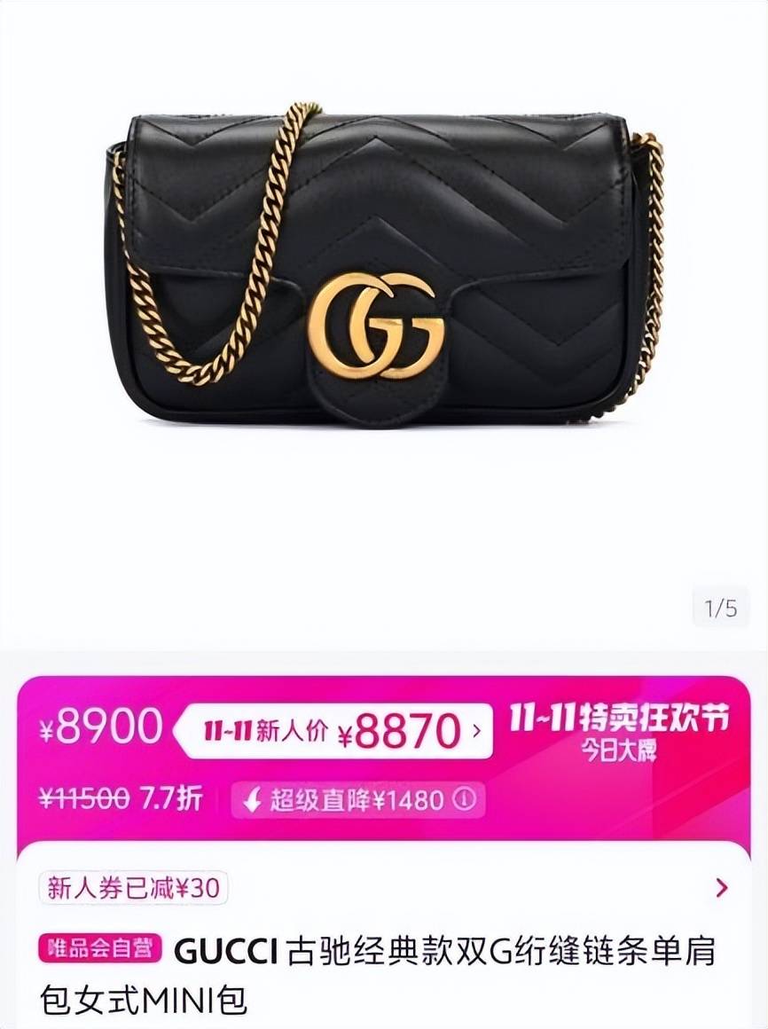 好奇心作祟想知道唯品会的折扣奢侈品到底有多划算,所以上唯品会搜了同款,原价11500元,7.7折之后只要8870元,也就是说相当于便宜了2600多,确实比专柜上的要划算不少。