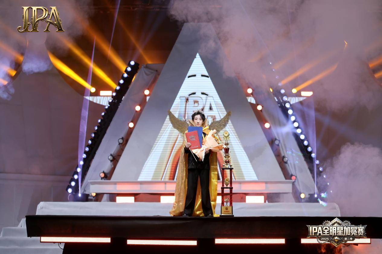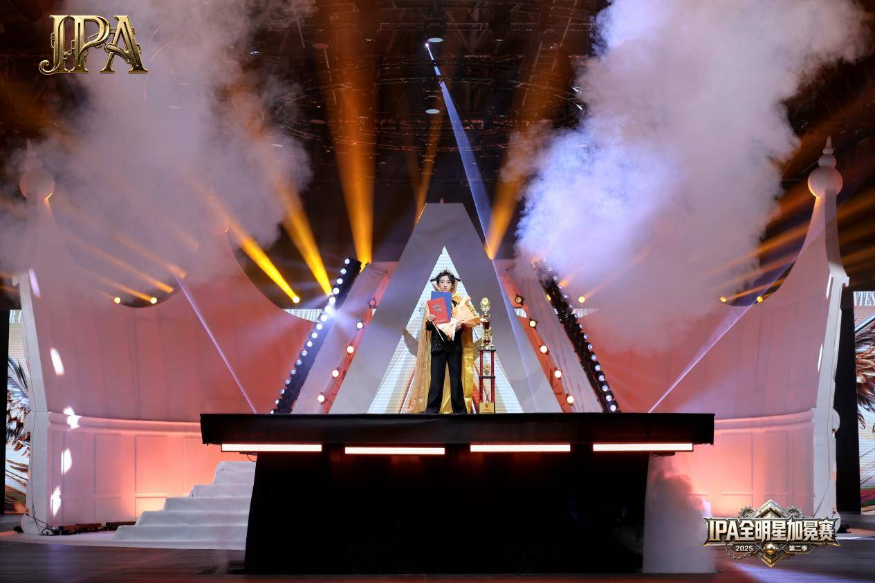 颁奖典礼现场,舞台以金色王座、层叠阶梯为核心,烟雾与追光交织出梦幻庄严的氛围。朱家树身披金色荣耀披风,手持巨型奖杯与荣誉证书,于全场瞩目下登上王冠宝座、双升降台加冕! 身后 “IPA” 标识与金色羽翼装置熠熠生辉,灯光凝聚、掌声沸腾,“全球冠军” 的殊荣,是对他舞台实力与人气的最佳见证。