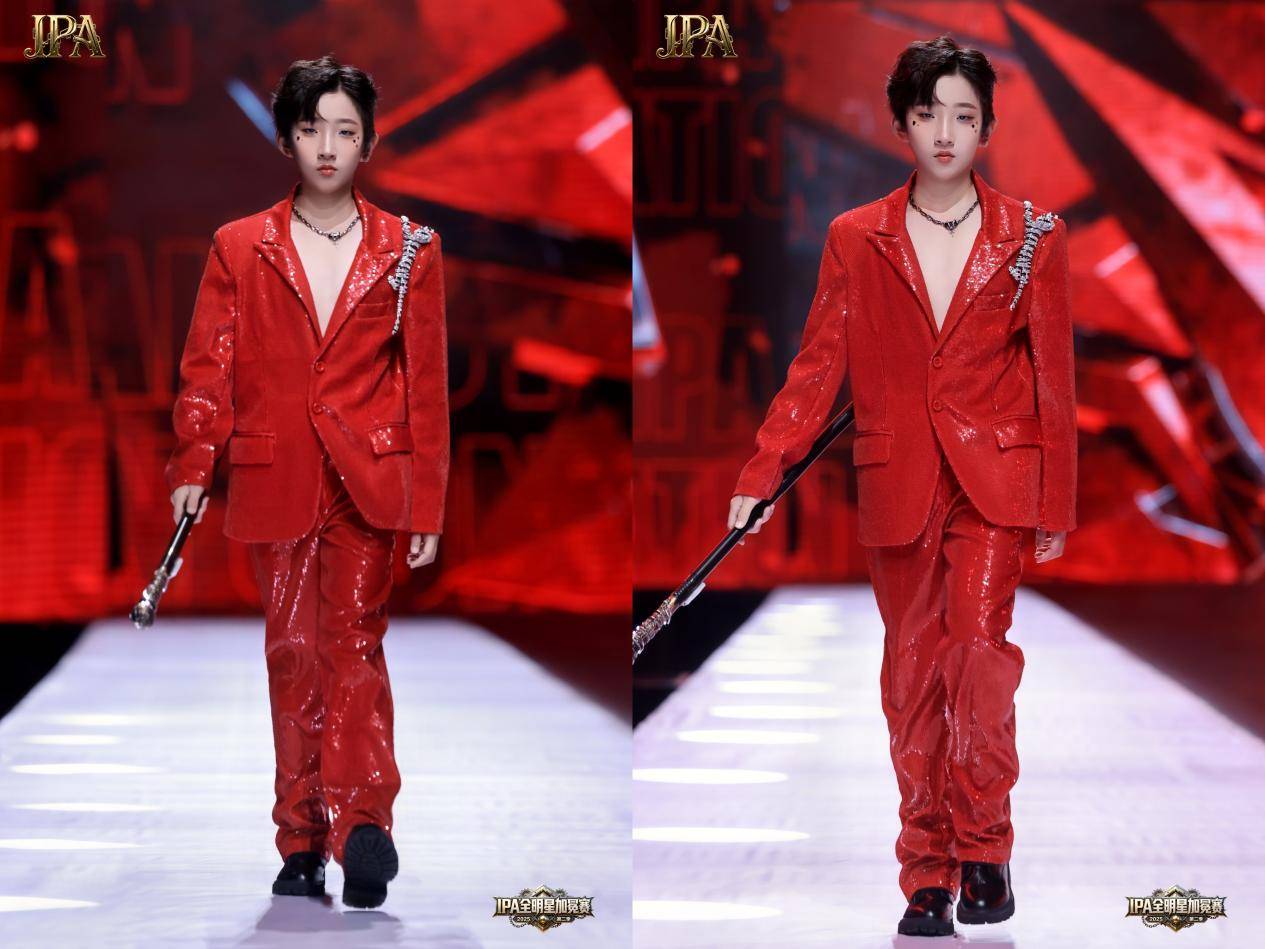 在 “登峰” 主题比赛环节,朱家树以一袭正红色亮片西装套装亮相。西装肩部的闪钻装饰如火焰淬炼的勋章,亮片随步伐流转,仿佛将星河融入衣摆;他手持金属质感权杖,每一步都传递出 “登峰” 的笃定与霸气。红色背景与造型交相辉映,少年如王者般从炽热光芒中走来,瞬间点燃全场氛围。