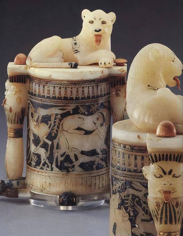还有纯金打造的王座,椅背上镶嵌着松石、玛瑙,画着图坦卡蒙和王后互相依偎的画面,连细节都精致到让人惊叹。
