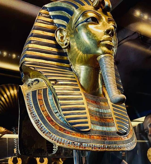 镇馆之宝就是那顶金光闪闪的黄金面具,高54厘米、重10.23公斤,完全按图坦卡蒙的脸庞打造,眼睛是黑曜石做的,眼白用石英镶嵌,前额还有鹰神和眼镜蛇神的图案,象征着上下埃及的王权。