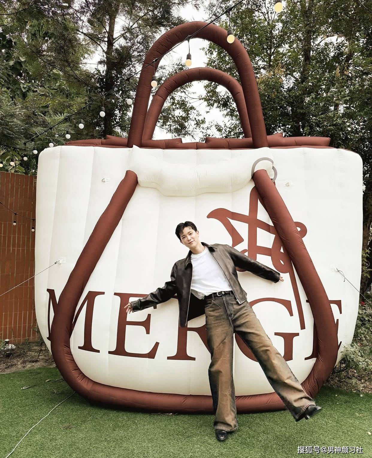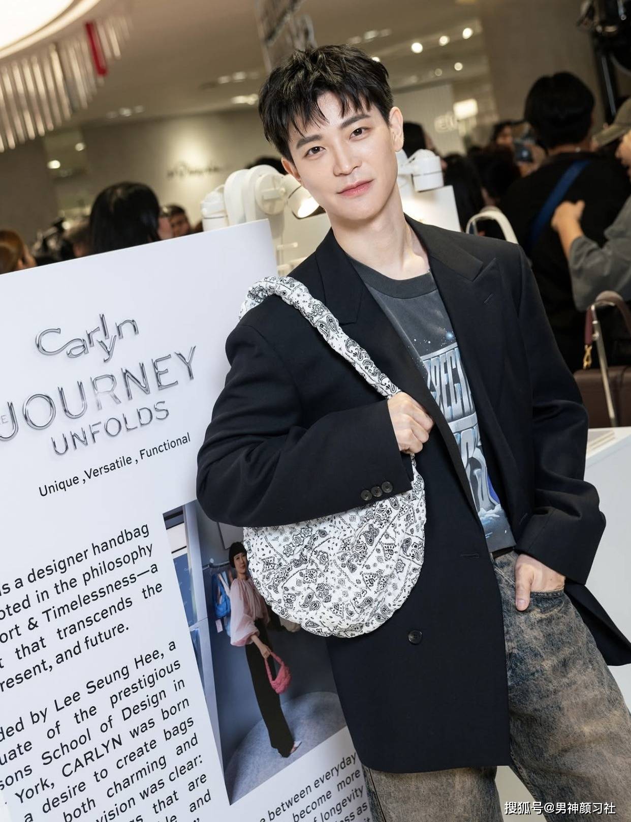 tie的西装造型也很聪明。他不追求标准的商务感,而是用一件有趣的字母短袖中和正式感。黑色西装+白T的反差,让人一眼就看到他的松弛感。