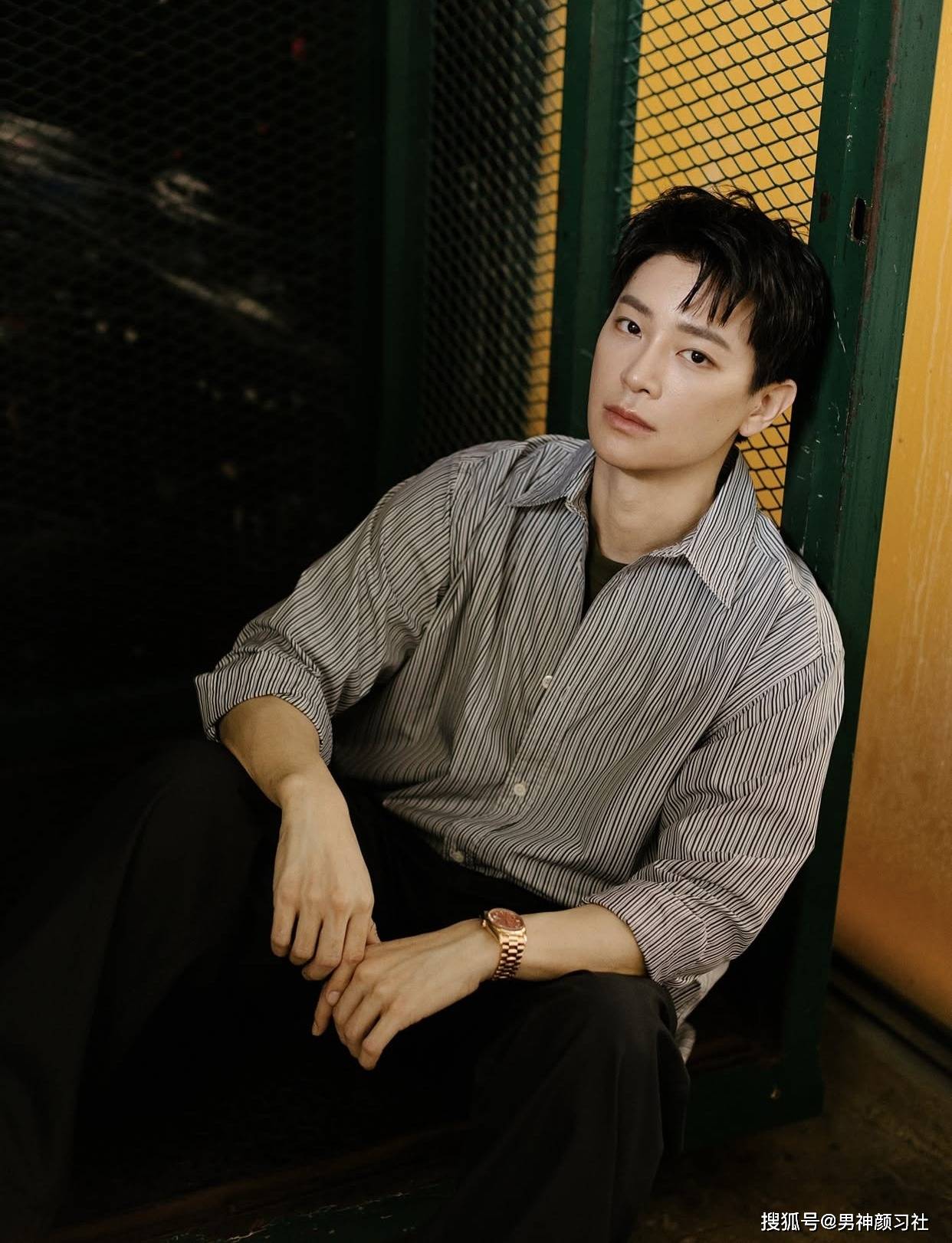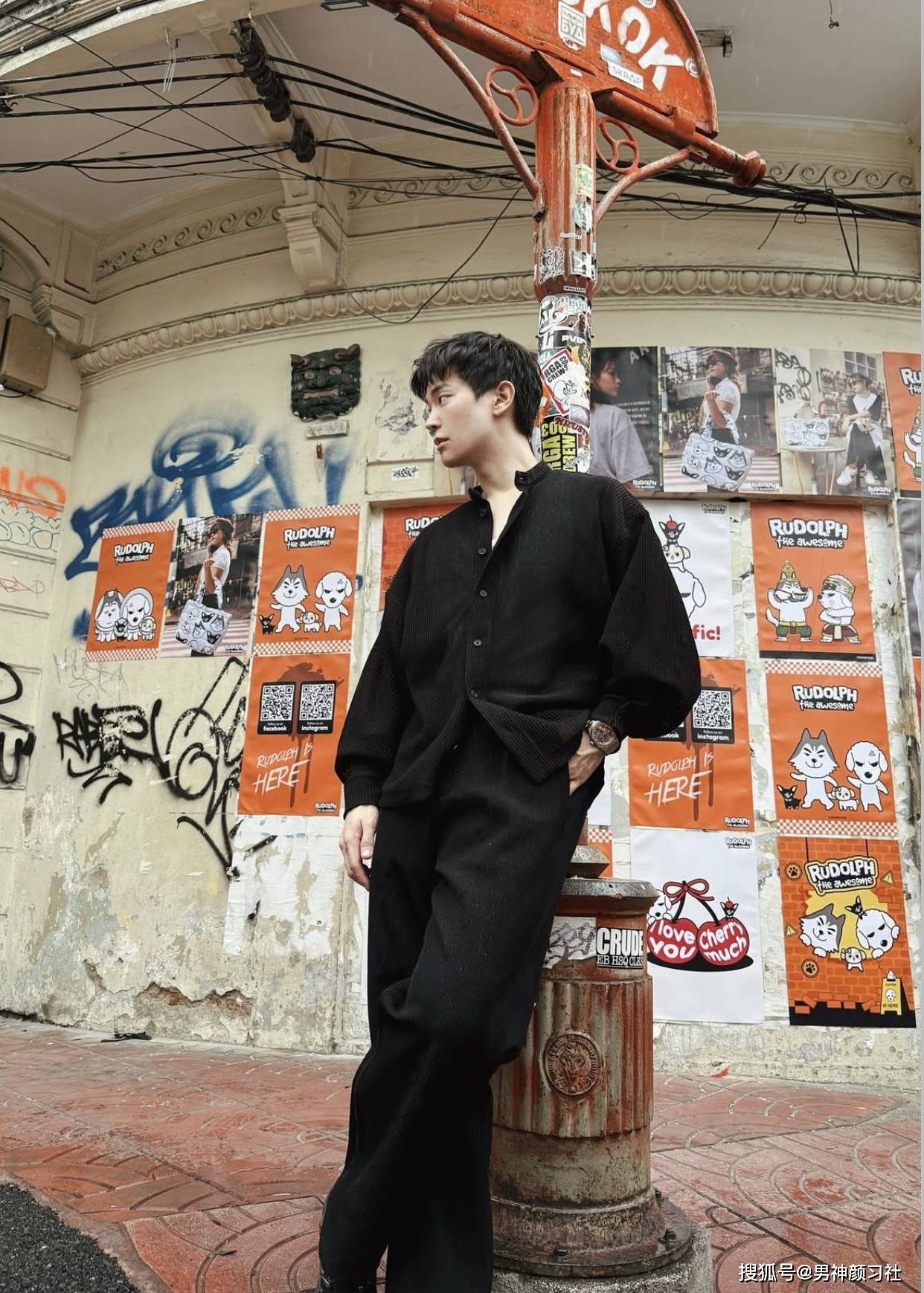 黑色衬衫也被他穿得很有味道,虽然是简单地搭配黑裤子,但他会的衬衫不会太贴身,衣服解开几颗纽扣,这些呼吸感,也让整套造型更有空气。