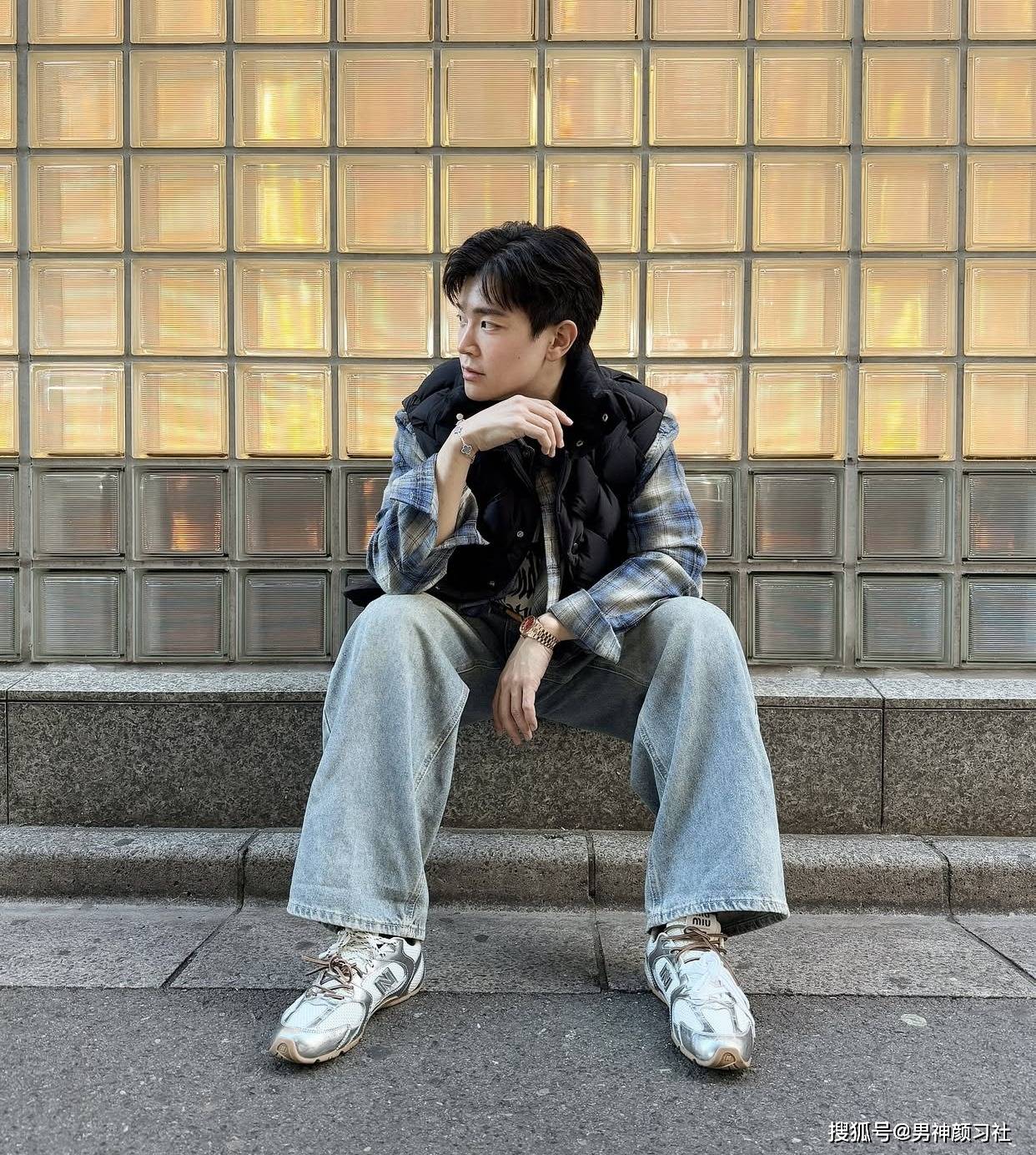 tie的蓝格纹衬衫造型特别有老钱休闲感,蓝格配蓝牛仔裤,叠穿羽绒背心,脚踩运动鞋,既有学生气,又有成熟感。这种穿法适合秋冬出行或城市通勤,层次感和舒适度并存。