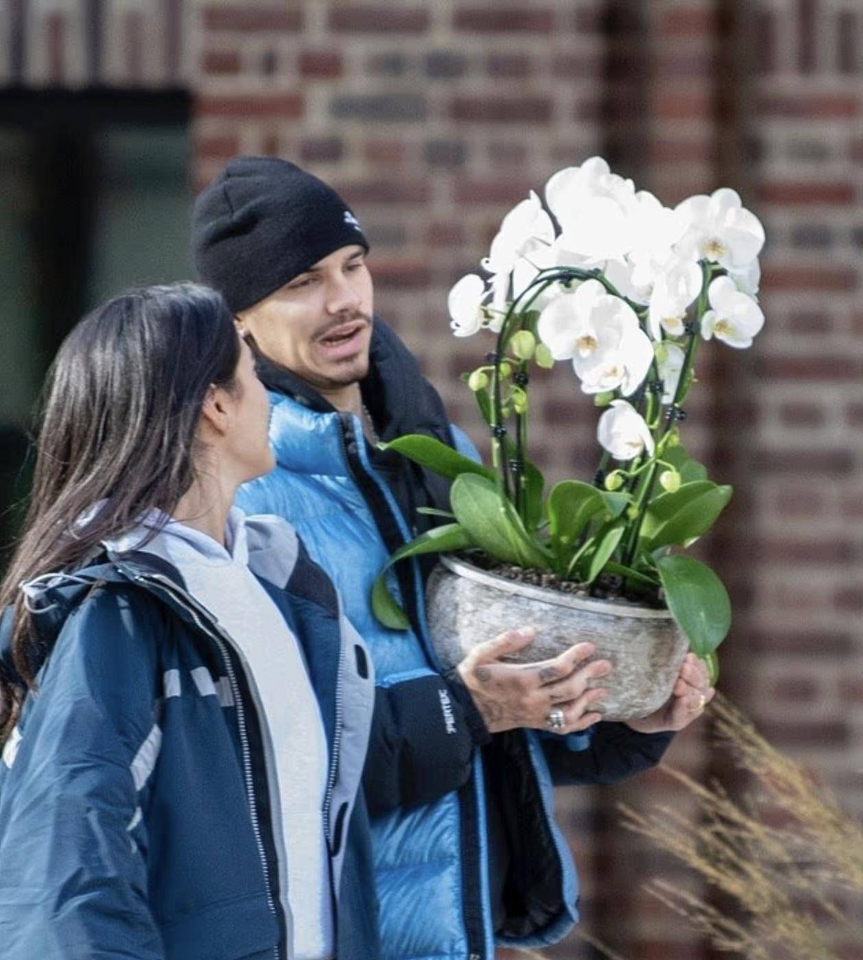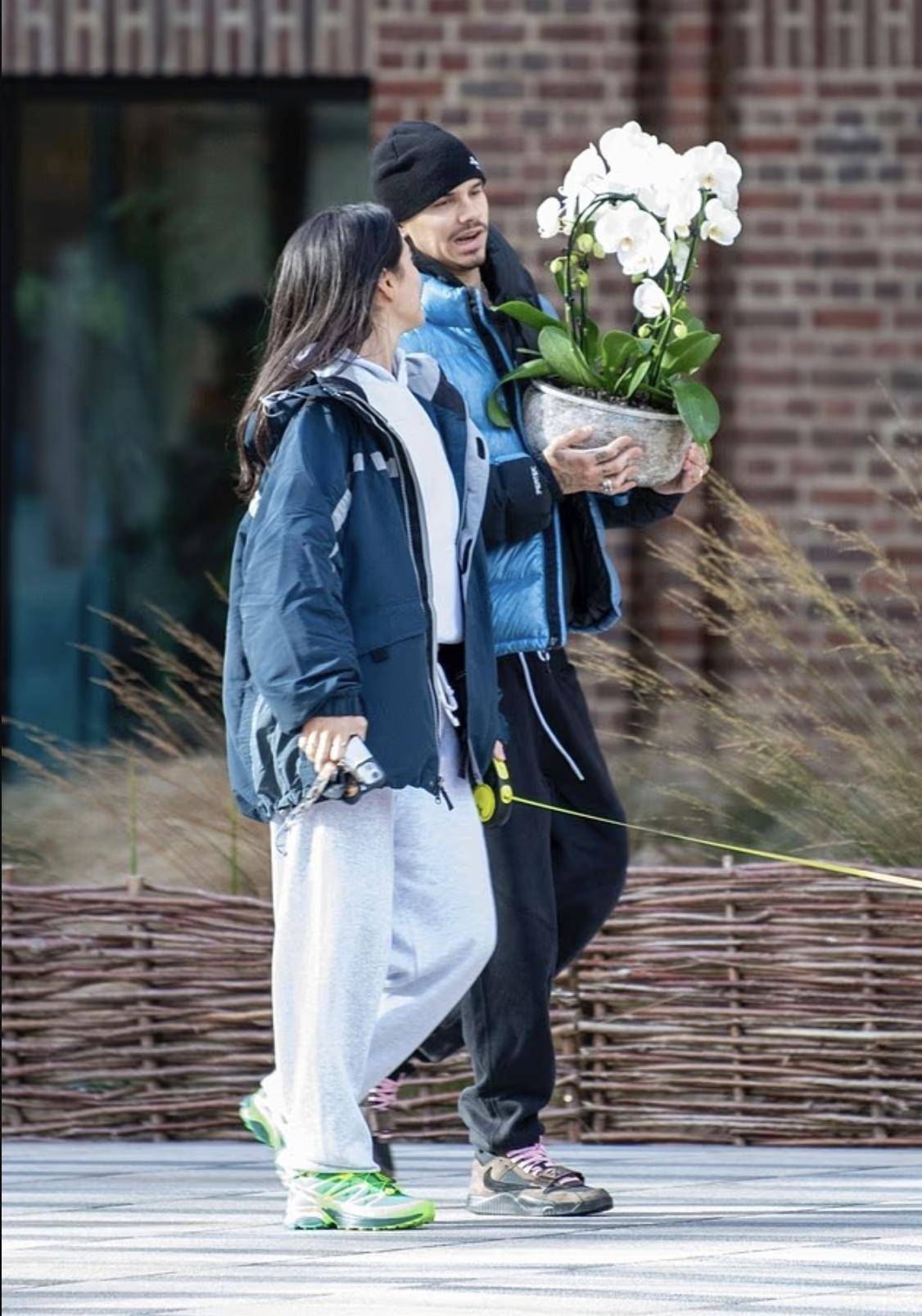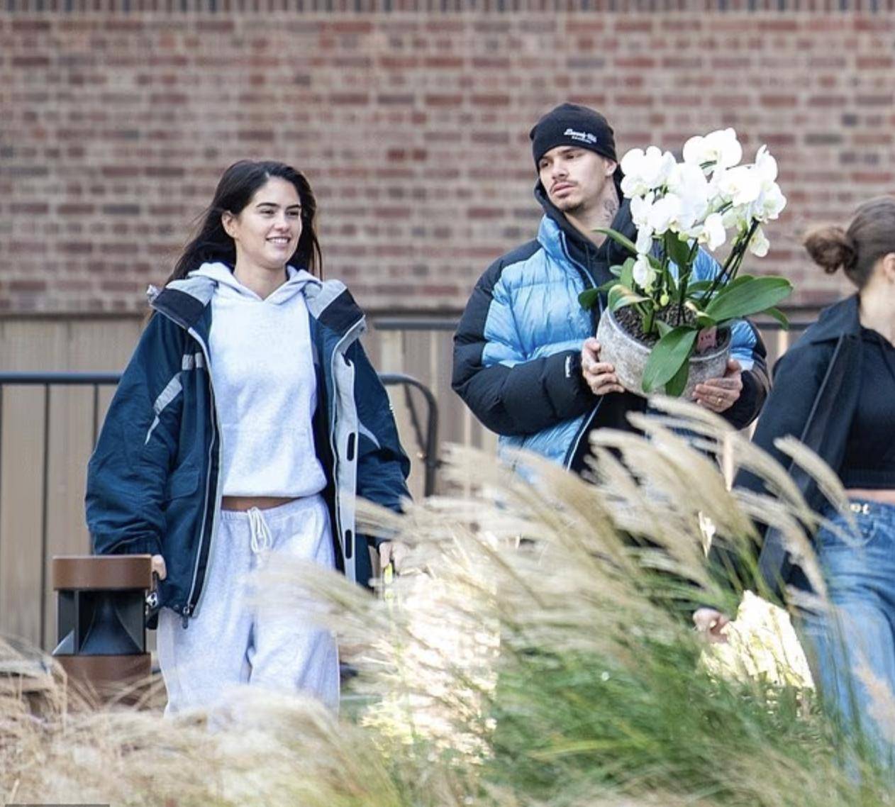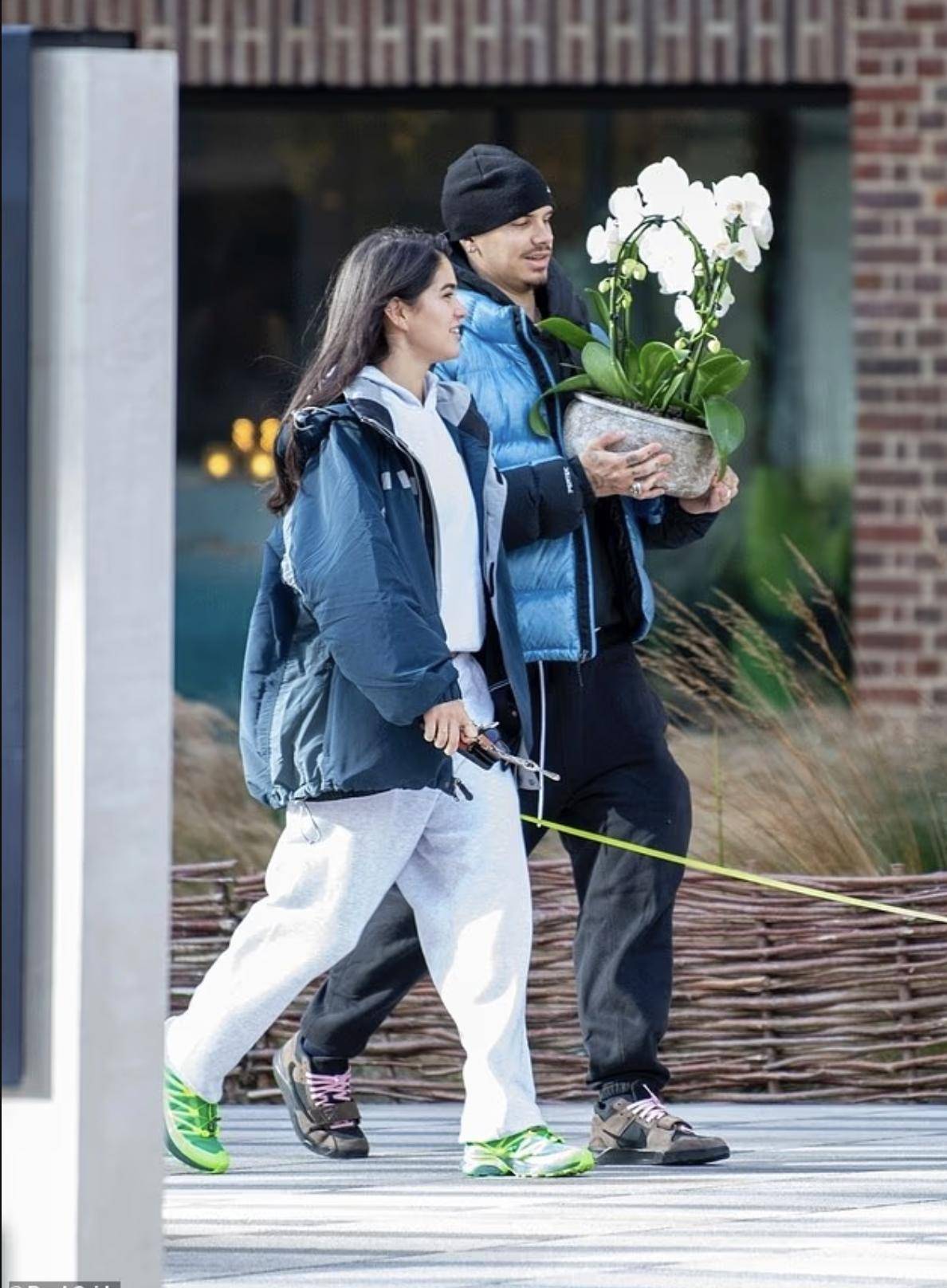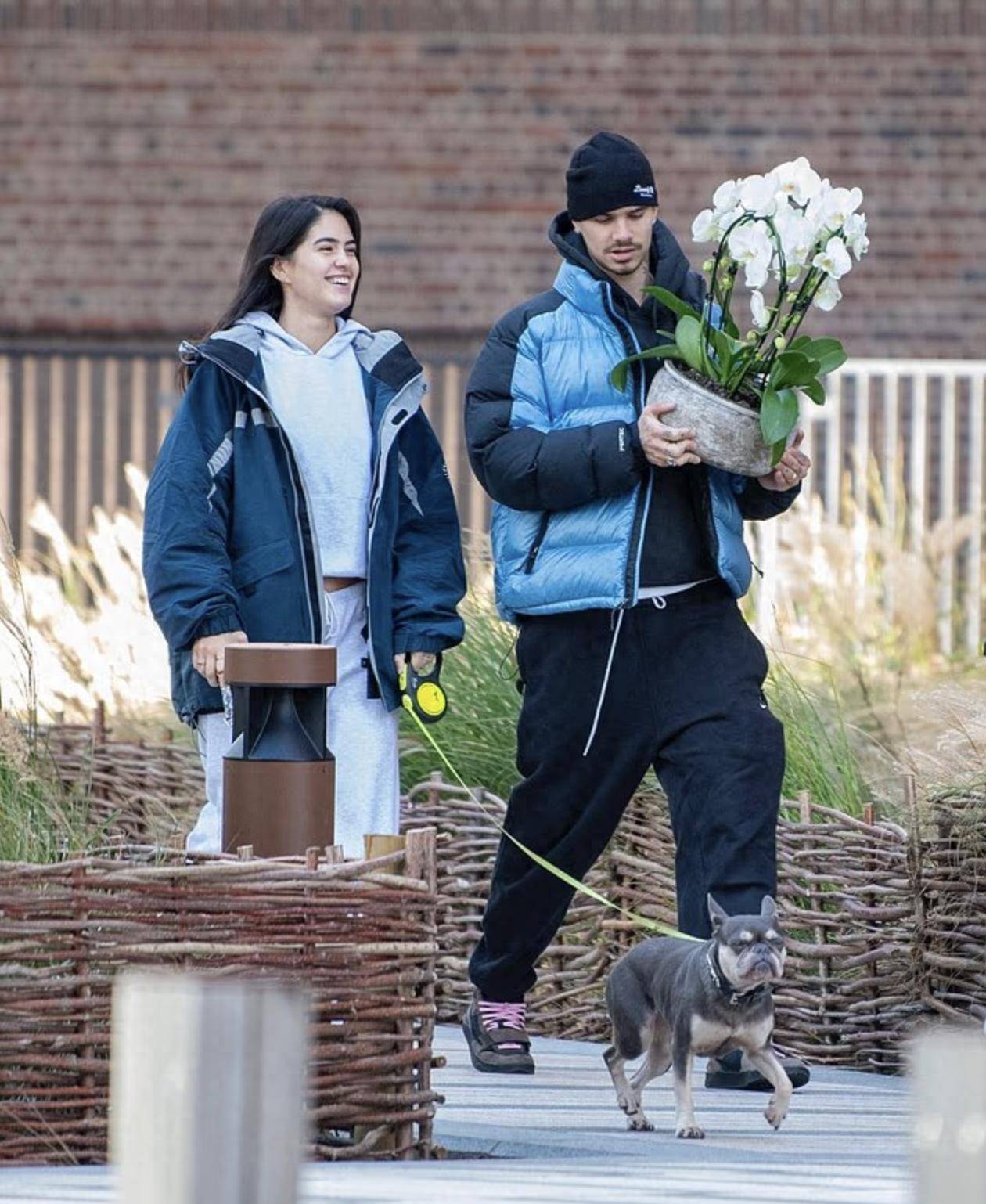 在伦敦街头,贝克汉姆家的二儿子罗密欧和他的25岁DJ女友金被发现共享甜蜜时光,手指上的闪亮金戒指引人注目。罗密欧一手捧着一大束鲜花,而金则牵着心爱的宠物犬,二人画面温馨,尽显情侣甜蜜。