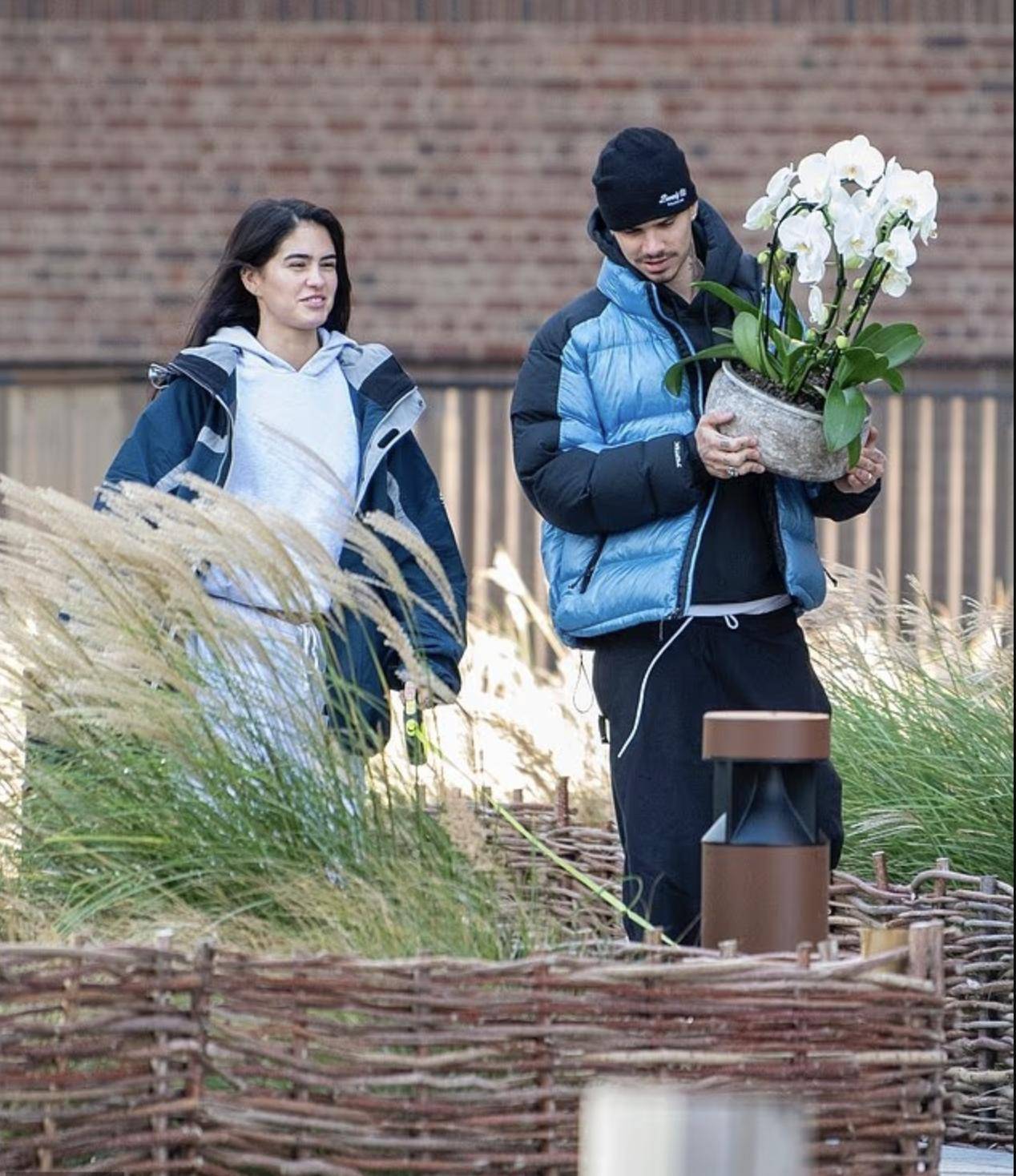 两人的穿着风格则十分低调而休闲。金选择了深蓝色的派克大衣,搭配灰色运动套装,而罗密欧则一身黑色运动服,外披蓝色宽松羽绒服,头戴黑色毛线帽,脚蹬一双棕色运动鞋,粉色鞋带勾画出几分独特的潮流感,展现出年轻人的时尚品味。