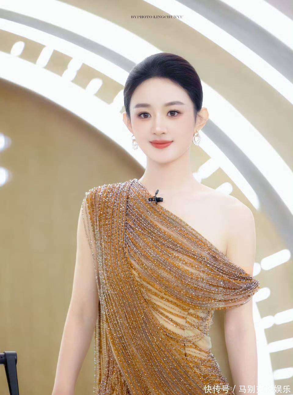 妆发方面更是亮眼,盘发高贵典雅,简直是“头骨优越症”现场。她的裸妆清透自然,只用了一抹红唇,虽然生图中皮肤的纹理清晰可见,但却紧致得令人惊叹,完全没有岁月的痕迹。配上闪耀的萧邦钻石耳环和项链,光影下珠宝与金色裙摆交相辉映,简直是“落日熔金化作星辰”。十年如一日的颜值,赵丽颖的状态真不是吹的。
