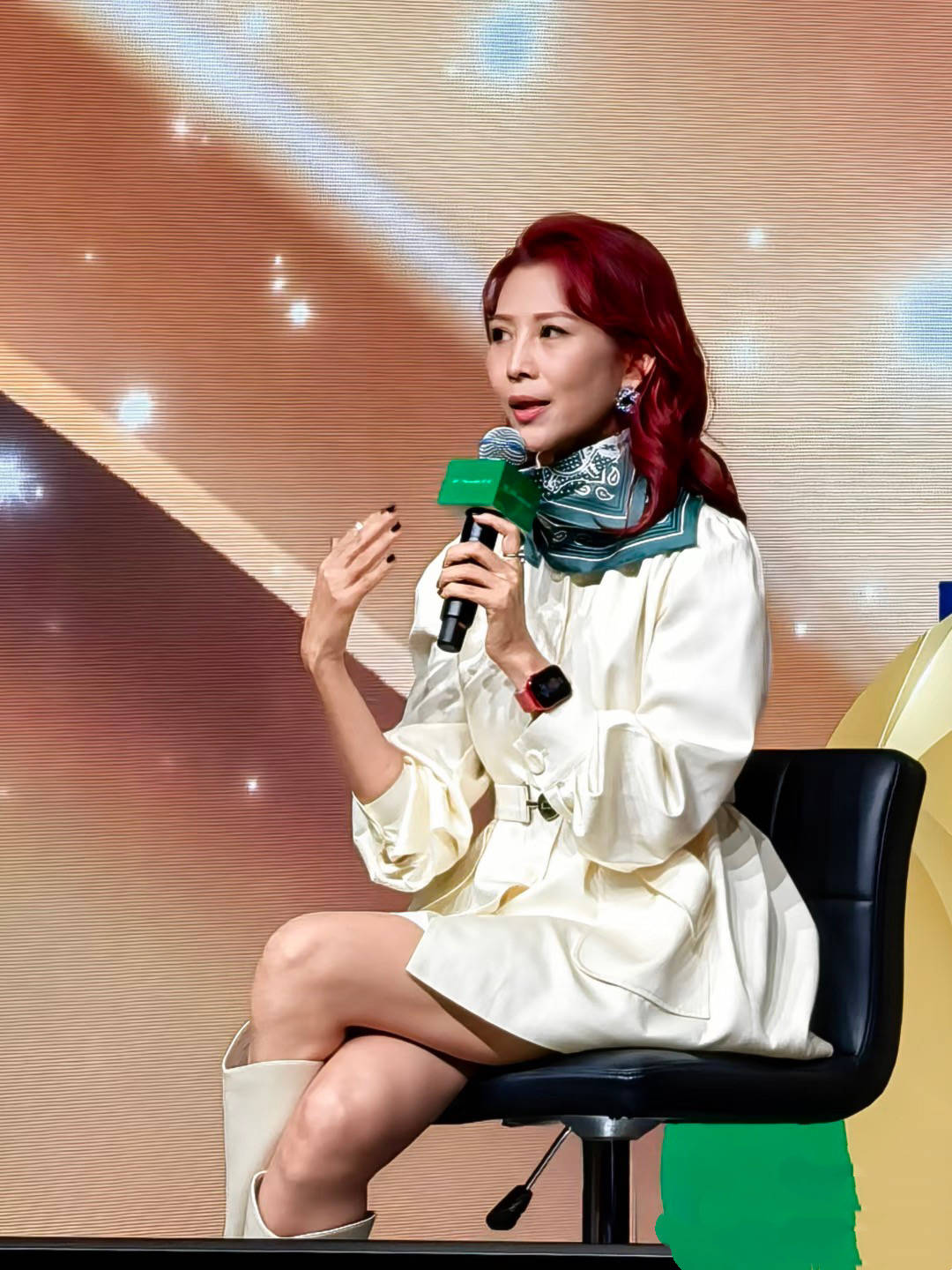 在香港新品发布会上,52岁的蔡少芬展现出惊人的状态。她穿着一套简洁的白色商务短裙,搭配厚底及膝长靴,整个人散发出优雅与贵气的气质,红色卷发和绿色丝巾的搭配更显得别致,耳环闪烁着低调的光泽。她的精神状态十分饱满,毫不逊色于年轻人,完全看不出已经是三个孩子的母亲,更无法猜出她年过半百的事实。她的皮肤紧致光滑,完全没有岁月的痕迹,脸上的苹果肌依然丰满,细纹也几乎不见。