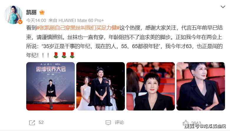 面对争议,张凯丽迅速做出了回应。她首先针对部分网友将她穿黑丝的形象与足力健老人鞋的代言形象相混淆的情况进行了澄清,明确表示自己与足力健老人鞋的代言合同早在5年前就已经终止。同时,她直言自己一直都有穿丝袜的习惯,强调年龄并不能成为阻挡人们追求美的脚步的障碍。她还引用了自己在两会上的发言“35岁正是干事的年纪,55岁、65岁依然年轻”,称“63岁正是闯的年纪”,用这样充满活力和自信的话语来反击社会上存在的年龄偏见。