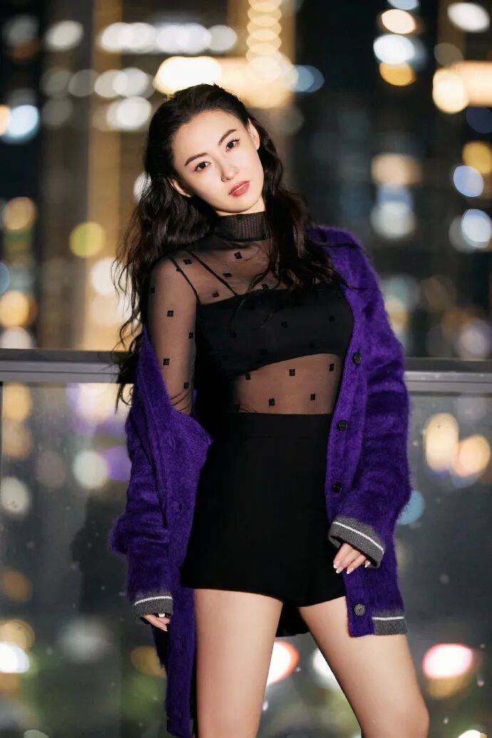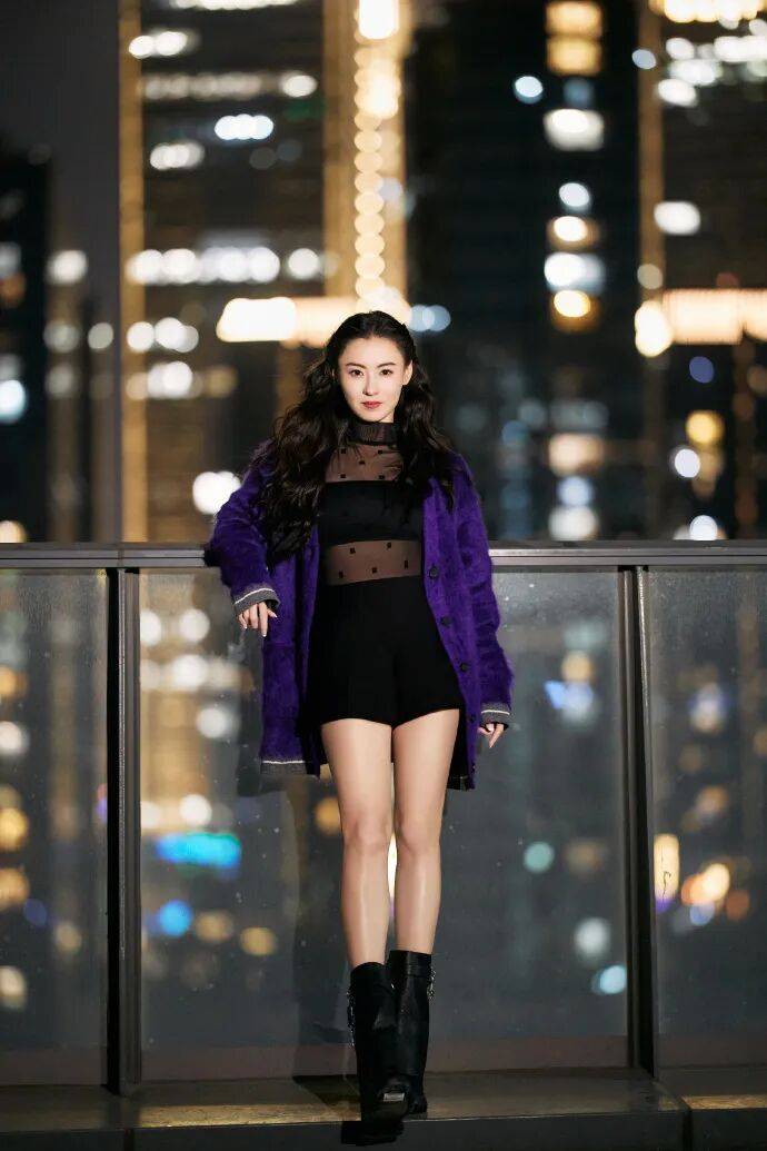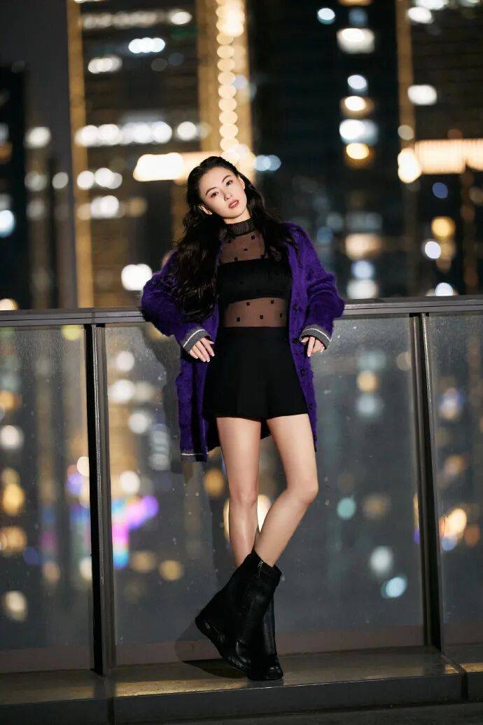 镜头里的她像颗被精心打磨的黑曜石。毛绒外套的紫色浓得化不开,像是把九十年代兰桂坊的夜色揉碎了织进衣料。可偏要内搭件波点透视装,黑色网纱上跳动的圆点,像极了当年王家卫电影里漏进阁楼的雨滴。短裤与长靴的组合更是妙笔,双腿在皮革与霓虹间拉出修长的光影,让人想起《重庆森林》里金城武追着过期凤梨罐头狂奔的长街。
