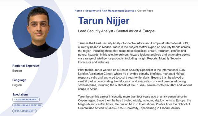 目前他住在西班牙的马德里,在 International SOS 担任中非和欧洲安全分析师(Security Analyst for Central Africa and Europe),这是一家提供全球医疗和安全服务的私营咨询公司,他是该地区安全趋势方面的专家,涵盖社会动荡、恐怖主义、冲突和自然灾害等相关趋势。在他的岗位上,他通过一系列情报产品,包括洞察报告(Insight Reports)、月度安全预测(Monthly Security Forecasts)和网络研讨会,提供前瞻性分析和可操作的建议。