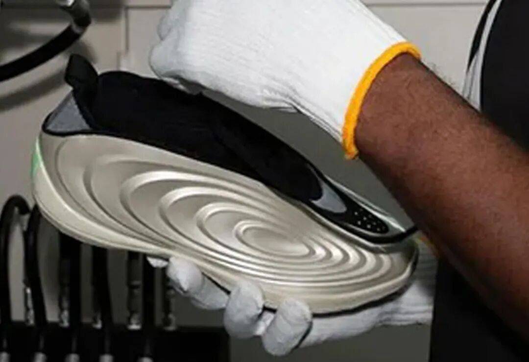 从放大的图片可以看到这双鞋的细节,在鞋型轮廓上沿袭了 9 代的设计,但类似水波纹样式的多层环形造型颇具冲击力,使其有着独特的视觉辨识度。